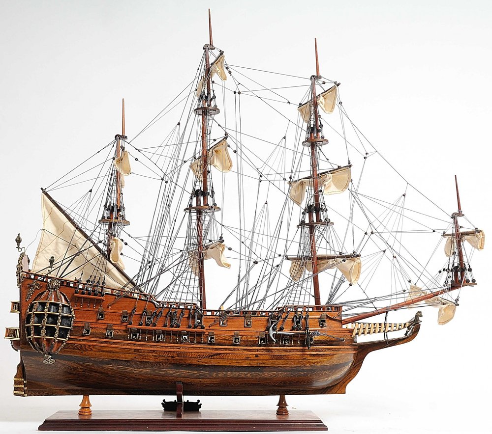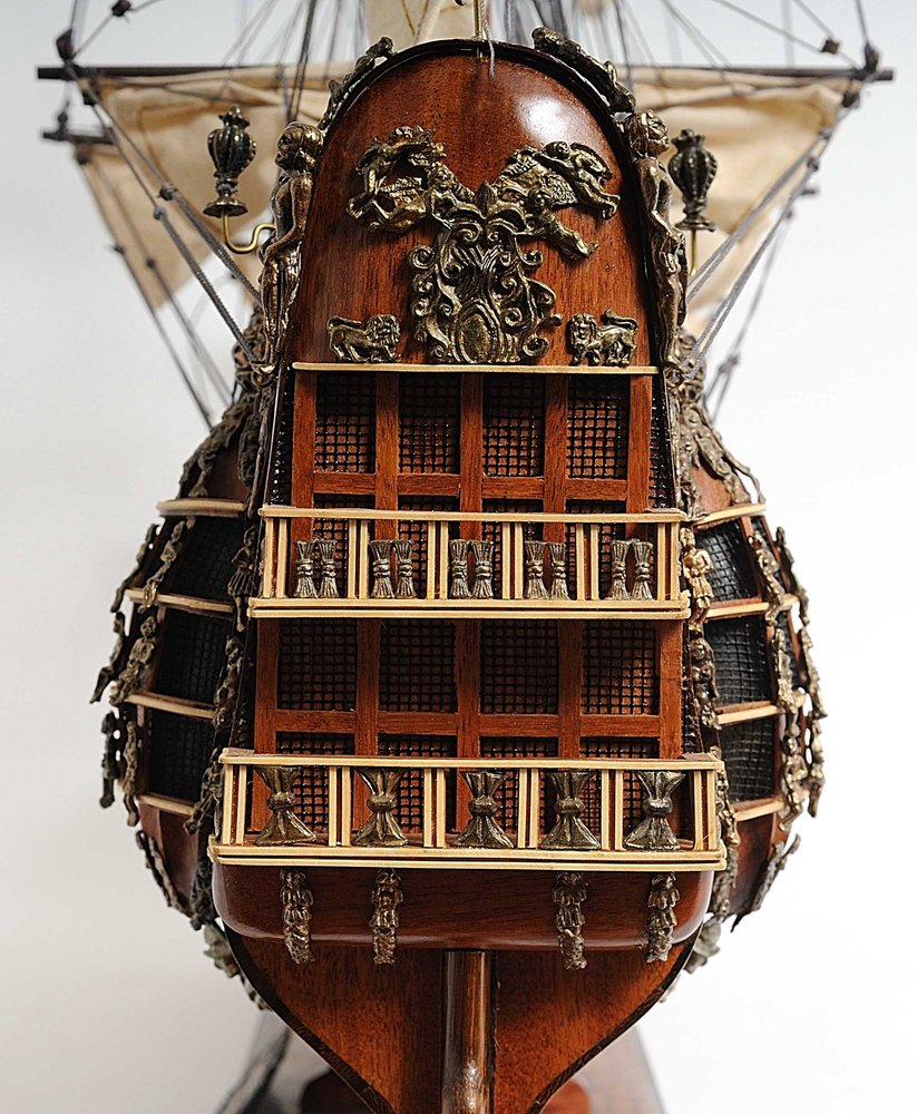 Display this Royal Navy HMS Fairfax of Commonwealth of England right in your own home or office! The Fairfax, built by Peter Pett I at Deptford and launched in 1650, is available as a museum-quality, FULLY ASSEMBLED model. Master craftsmen using historical photographs, drawings or original plans meticulously handcraft these highly detailed wood models from scratch. They are built to scale with high-grade wood such as: western red cedar, rosewood, and mahogany. They are 100% hand built individually using plank-on-frame construction method and are similar to the building of actual ships. Each model requires hundreds of hours to finish and must go through a demanding quality control process before leaving the workshop. The HMS Fairfax model features plank on frame, three decks, and two rows of ferocious metal cannons on each side of the ship. The front bowsprit and three large masts are connected securely using advanced rigging and lines painstakingly knotted and fastened by hand. Each yard has an attached hand-stitched rolled-up sails made of fine linen.. On the deck, there are authentic hand-built lifeboats with ribs and planks, metal captains steering wheel, metal lanterns, wooden capstan, wooden cabin, and many other handcrafted ornaments. There is also an exquisite detailed admirals quarter on stern with beautiful handcrafted brass statues and ornaments. This model comes standard with a solid wood base and brass nameplate. Itll make a perfect gift for home or office decorator, boat enthusiast or passionate collector.