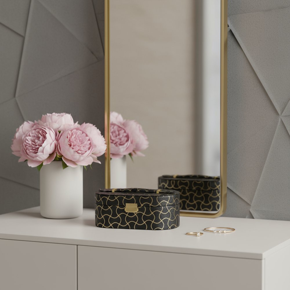 The 10-inch black and gold faux leather abstract scroll jewelry box travel case with mirror is a stylish storage solution for your cherished accessories. Finished with durable faux leather on the outside and microfiber suede on the inside, this contemporary case combines elegance with practicality. Its chic black and gold color palette adds a touch of sophistication to any bedroom decor. The oval shape and hinged lid design make it easy to open and access your jewelry when needed. Perfect for travel, this case ensures your items remain organized and protected, while the built-in mirror allows for convenient styling on the go. Elevate your accessory organization with this beautifully designed jewelry box that seamlessly blends functionality with aesthetic appeal. 3.50-inch h x 9.50-inch w x 5.00-inch d.