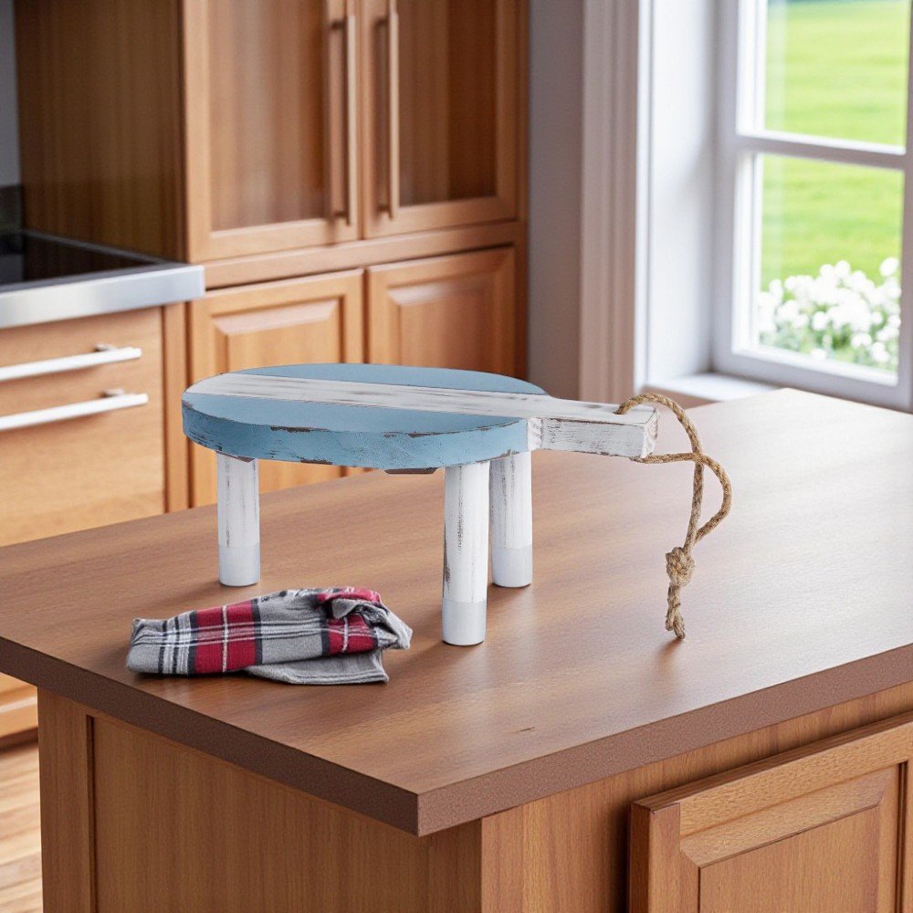 This round riser tray is crafted from solid wood, showcasing a beautiful blend of blue and white hues that have a calming coastal vibe. Its rustic style is enhanced by purposeful distressing, giving it an artisanal handcrafted charm and vintage appeal. This riser board tray is not only functional but also adds character to your space. Designed for everyday use, it can elevate any setup, making it versatile and stylish. 6.50-inch h x 14.50-inch w x 9.50-inch d.