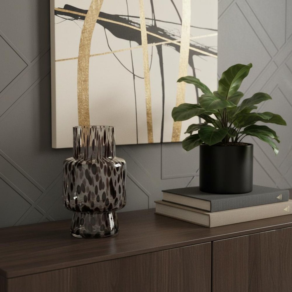 With or without flowers, this 10-inch clear burgundy and black abstract glass cylinder table vase makes a great gift or decorative accent for your space. The striking design and rich colors add a touch of elegance to any room. Crafted from high-quality glass, this vase is durable and allows for easy cleaning. Its unique cylindrical shape enhances the overall aesthetic, making it a versatile piece for various decor styles. Whether used as a standalone statement piece or as part of a beautiful floral arrangement, this vase will elevate your interior decor effortlessly. 10.00-inch h x 5.90-inch w x 5.90-inch d.