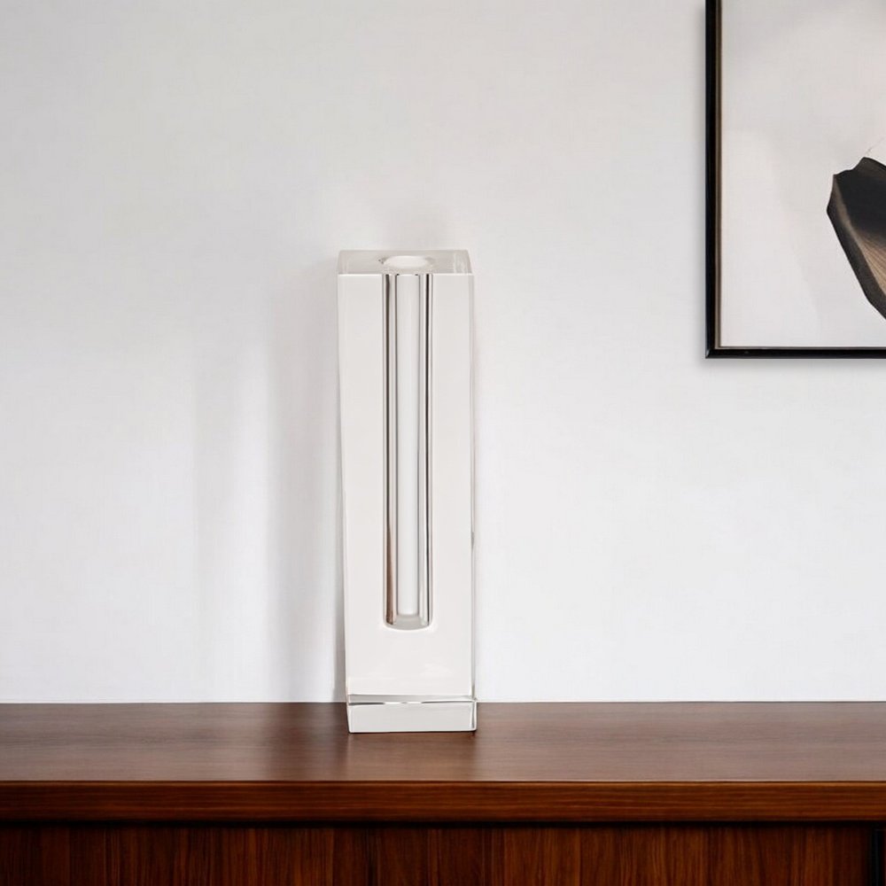 Elevate your space with this stunning 10-inch clear cylinder crystal glass table vase. Its sleek cylinder shape adds a modern touch to any room, while the crystal glass material exudes elegance and sophistication. The clear color allows for versatile styling options, perfect for contemporary decor themes. This exquisite table vase is a statement piece on its own or can be filled with your favorite blooms to create a striking centerpiece. Ideal for displaying on a mantel, shelf, or dining table, this vase is a must-have for adding a touch of glamour to your home. 10-inch h x 3-inch w x 3.5-inch d.