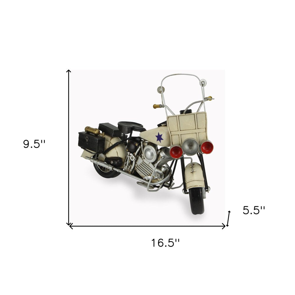 Unique and decorative, this 10-inch cream metal hand painted early 1900-foots police motorcycle model model motorcycle will leave a lasting impression. The cream coloring of this high quality metal accent will look great in most any space. A perfect decorative addition for anyone who loves a stylish look and feel. 9.5-inch h x 16.5-inch w x 5.5-inch d.