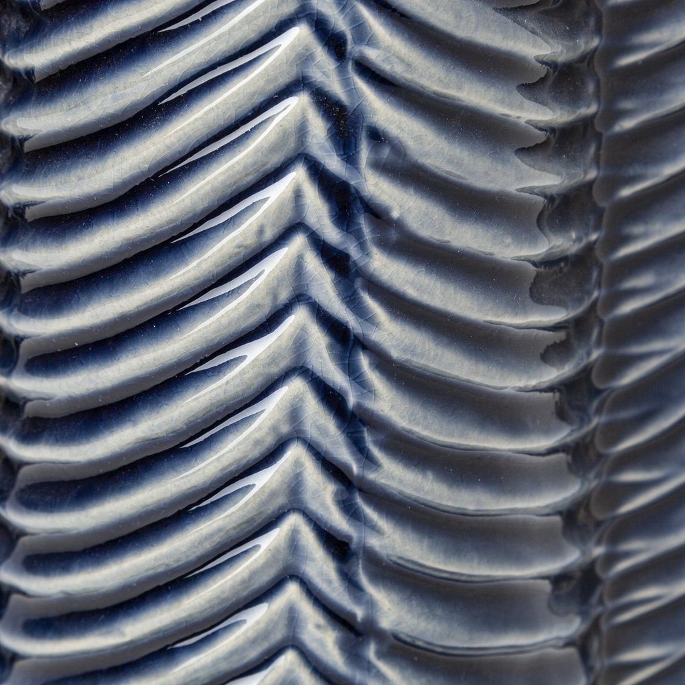 Add a unique design touch to any space in your home with this Petite Navy Blue Glaze Layered Patterned Star Vase. This vase is made from ceramic and has a star shape to it. This star shape has four corner with each corner adding more depth to the overall look. On the body of the vase there is a carved striped pattern that follows the shape and has a Navy Blue translucent glaze that shows the ware through the glaze. This vase is perfect for displaying floral arrangements as the neutral shades will work nicely with the darker tones. You can also use it as a stand alone decor piece on your bookshelf, or your kitchen counter. 10" H x 5" W x 5" D