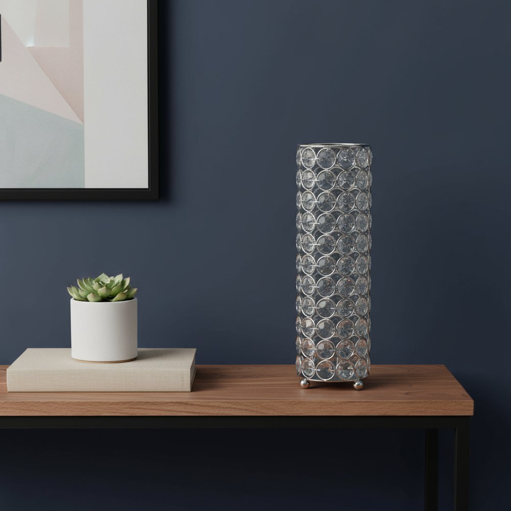 Ideal for displaying fresh or dried flowers, it effortlessly elevates your home ambiance. This elegant table vase showcases a stunning cylindrical shape that adds a modern touch to any decor. Crafted from high-quality metal and faux crystals, it dazzles with its clarity and brilliance, enhancing the beauty of your floral arrangements. Additionally, the vase is adorned with exquisite crystal bling, adding a hint of luxury that captures attention. This versatile piece complements both contemporary and classic interiors, making it a must-have for any home enthusiast looking to create an inviting atmosphere. 10.25-inch h x 3.25-inch w x 3.25-inch d.
