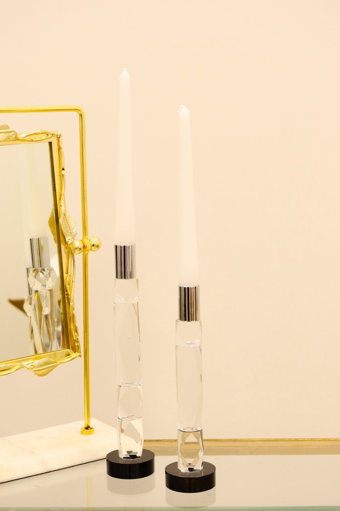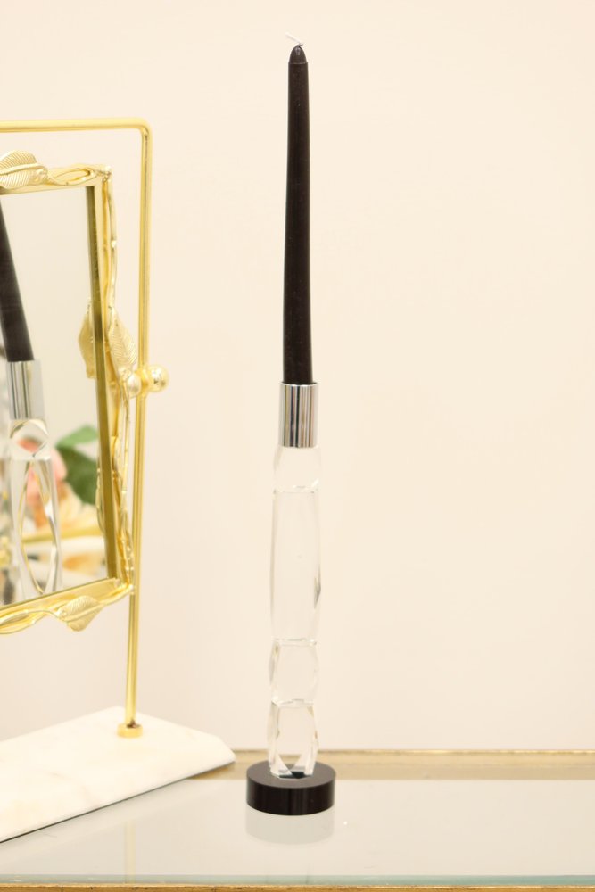 This 10-inch silver clear and black crystal tabletop taper candlestick is a great addition to your home decor. Dress up your home to impress every season with this fabulous candleholder. Features a modern and contemporary optical crystal layered geometric design in a chic clear and black color combination accented with silver at the top. 9.5-inch h x 2.5-inch w x 2.5-inch d.