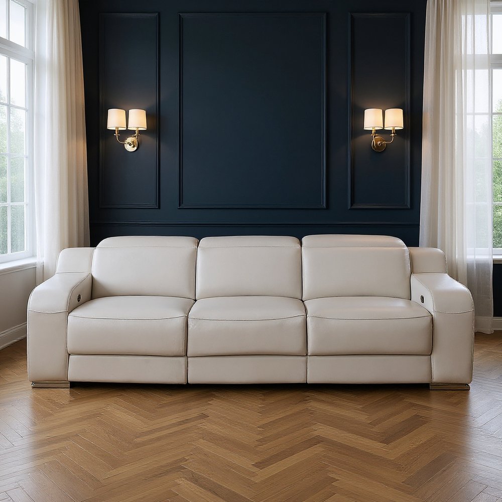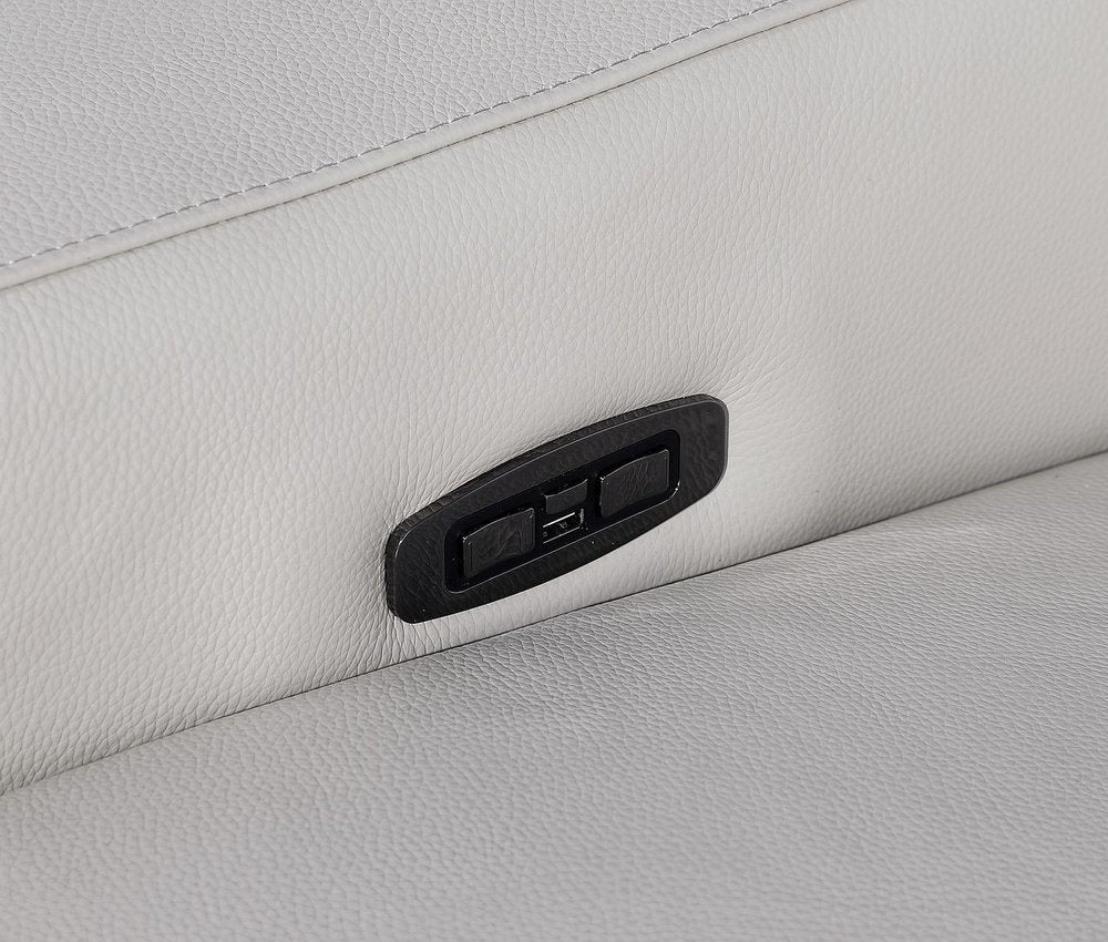 Superior construction from fabulously soft and high grade leather gives this 103-inch dark gray Italian leather reclining USB sofa with silver legs a leg up on the competition. The premium leather used makes your lounging luxuriously comfortable and adds an elegant appeal to your space. Dual power recliners and pocket spring construction give this piece strong support and makes it comfortable to sit even for long periods of time. Fixed arms offer a comfy place to rest. Clean lines and silver stainless steel legs effortlessly elevate the room and add a touch of contemporary design. A great showpiece for your room, this sofa is a must have. 30-inch h x 103-inch w x 41-inch d.