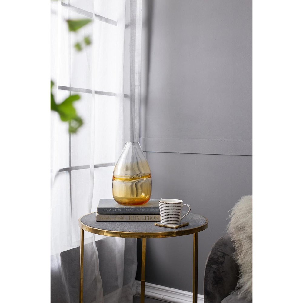 The 11-inch clear and brown ombre round glass table vase is a striking centerpiece that effortlessly elevates your home decor. Crafted from high-quality glass, this vase showcases a stunning ombre effect, transitioning beautifully from clear to rich amber brown tones. Its watertight design ensures that your arrangements stay fresh and vibrant, making it perfect for both casual and formal settings. The sleek lines, pop of swirling color, and minimalist aesthetic of this vase make it a versatile piece that complements a variety of decor styles. Whether placed on a dining table, a mantel, or a side table, it serves as a stunning centerpiece that draws the eye and enhances your interior design. 11.4-inch h x 7.1-inch w x 7.1-inch d.