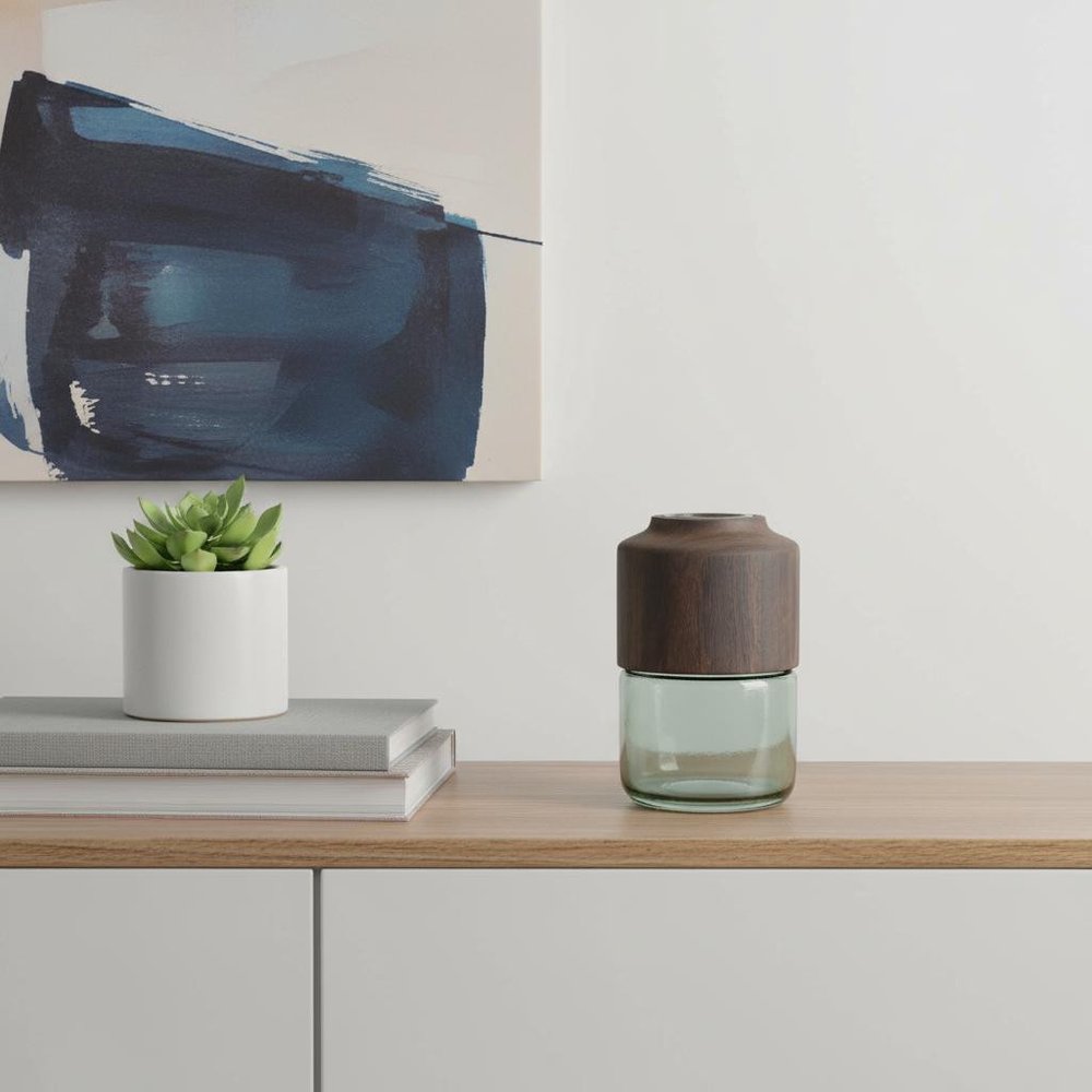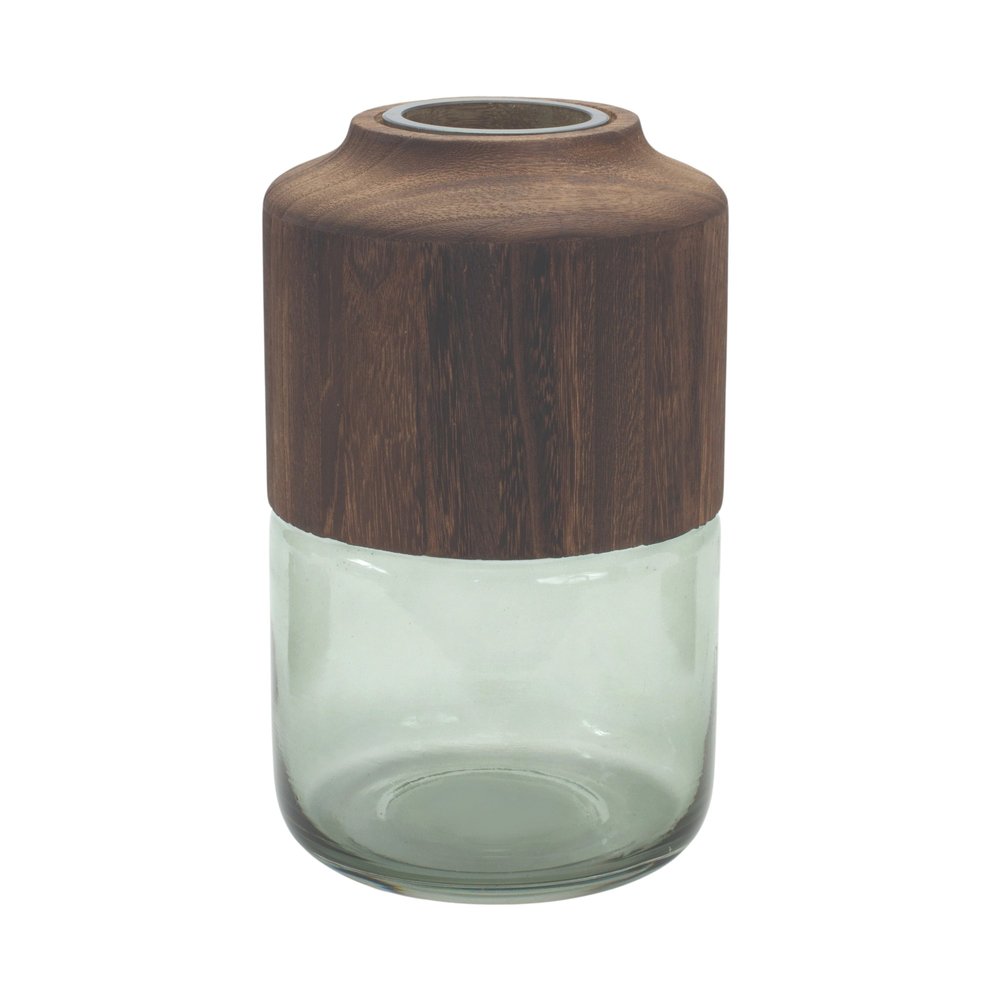 This 11-inch brown and sage glass round table vase with woods is the perfect accent for your living room, bedroom, dining room, or lounge. Its elegant design seamlessly blends modern aesthetics with natural elements, creating a striking focal point in any space. The round shape enhances its versatility, making it suitable for various floral arrangements or as a standalone piece. Crafted from high-quality glass, this vase ensures durability while maintaining a lightweight feel. The subtle earthy tones complement a range of decor styles, adding a touch of sophistication and warmth to your home environment. 11.00-inch h x 6.50-inch w x 6.50-inch d.