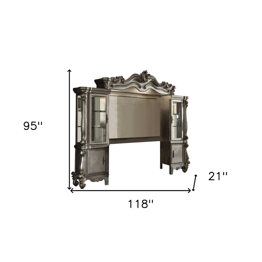 Practical, space-saving, and good looking, this 118-inch platinum solid wood floating mount entertainment center provides a versatile media storage solution. Crafted from solid wood, this tv stand design features a floating mount design that adds a contemporary touch to any space. The platinum color adds a sleek and modern aesthetic to your living room, bedroom, or office. The sturdy construction ensures durability for long-term use, making it an ideal choice for your entertainment needs. 95-inch H x 118-inch W x 21-inch D