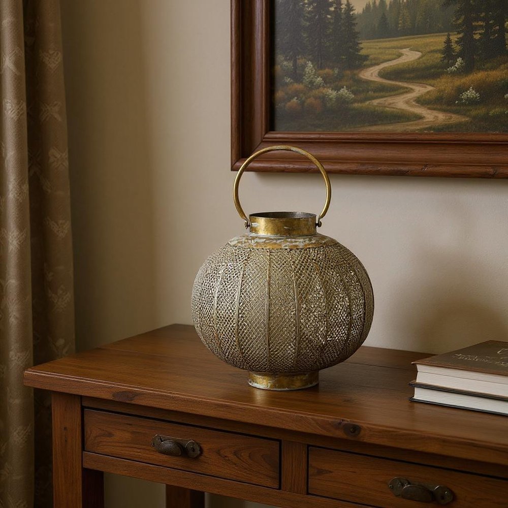 This 12-inch bronze and green distressed lattice metal tabletop lantern candle holder adds flair, function, and visual interest to any home or special occasion. Dress up your home to impress every season with this fabulous candleholder that features a pierced design in a warm golden bronze color with a rustic green patina. This rustic candleholder is a decorative accent onto its own, with or without candles. 11.50-inch h x 10.50-inch w x 10.50-inch d.