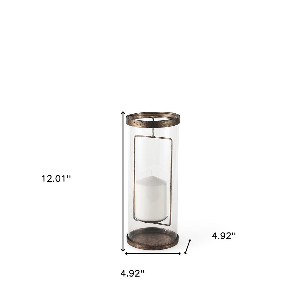 12" Copper Distressed Geometric Metal And Glass Tabletop Hurricane Candle Holder
