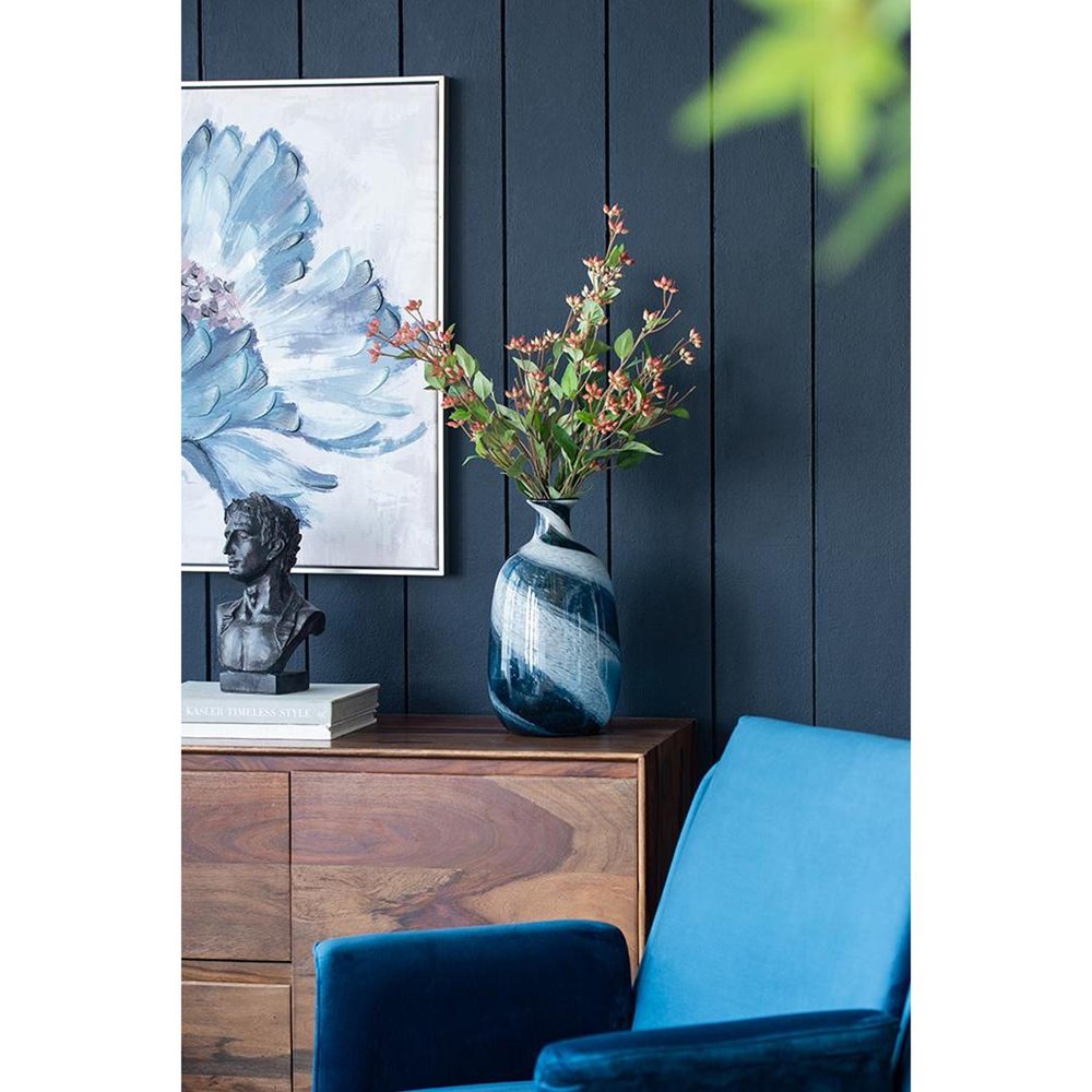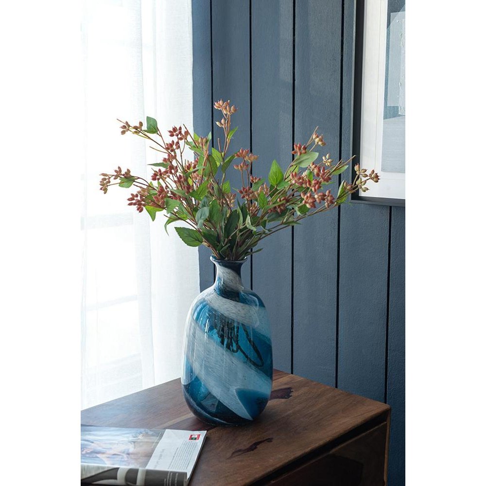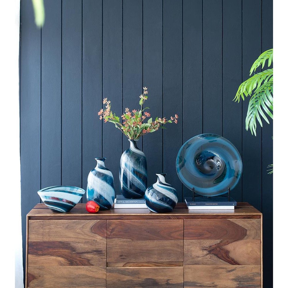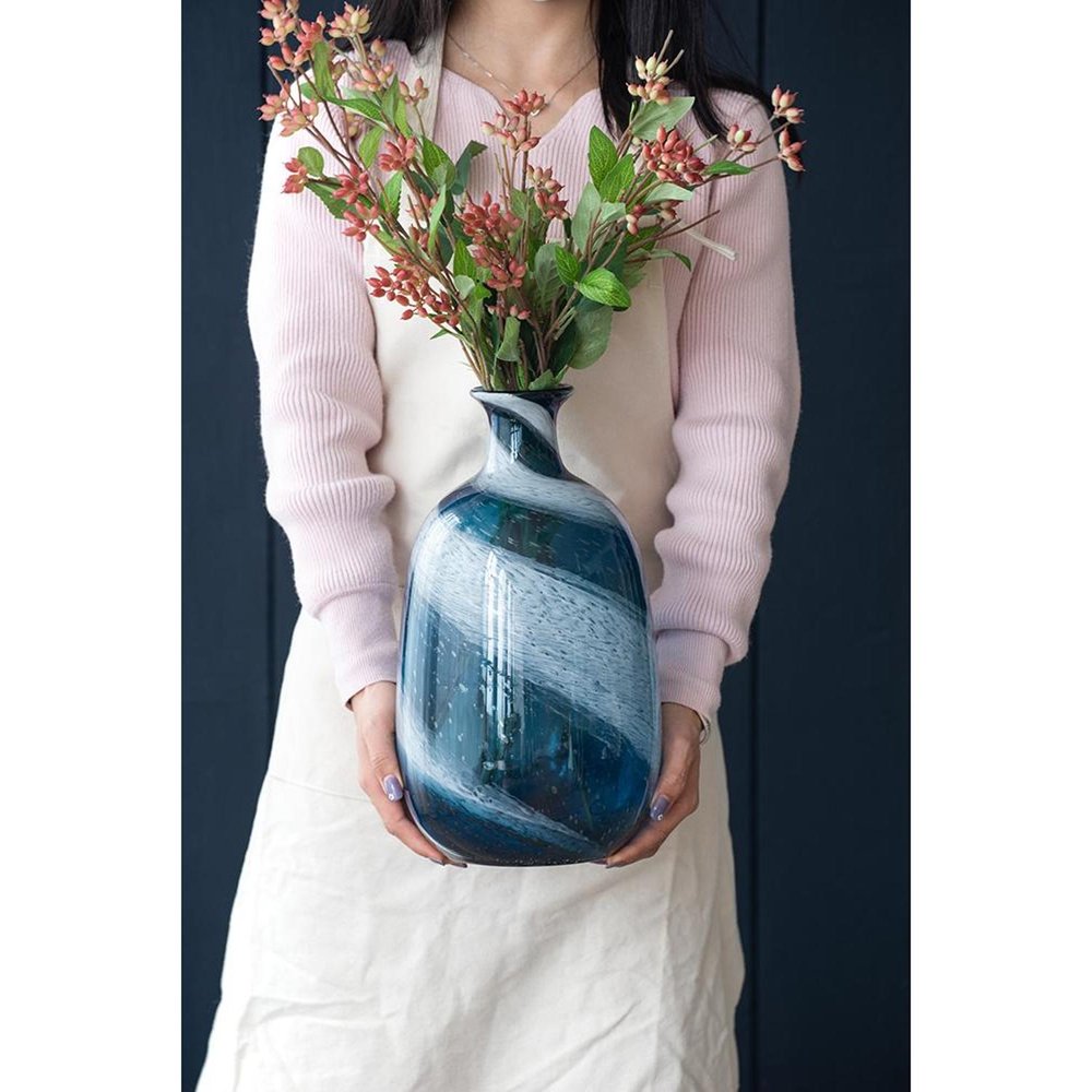 Get ready to accent your space in style with this 13-inch blue and white striped swirl art glass table vase. The elegant curved edge shape adds a modern touch while beautifully showcasing floral arrangements or decorative branches. Crafted from high-quality art glass, this handcrafted vase reflects light in a stunning way, enhancing the ambiance of any room. Its beautiful coloration and versatile swirling stripe design makes it a perfect addition to both contemporary and traditional decor themes. This eye-catching piece is sure to be a conversation starter and will elevate your interior design effortlessly. Bring sophistication and character to your home with this charming table vase. 13.40-inch h x 7.50-inch w x 7.50-inch d.