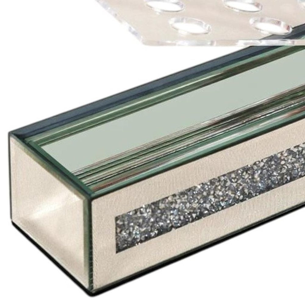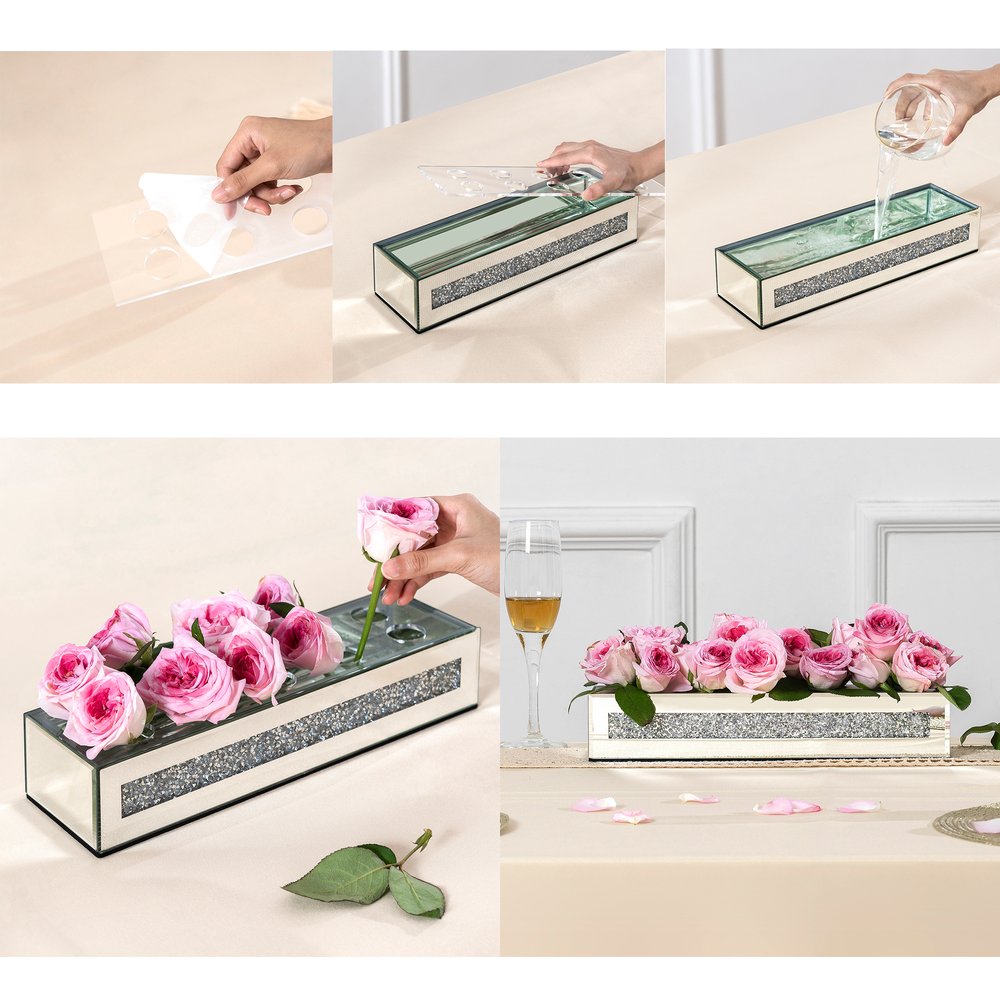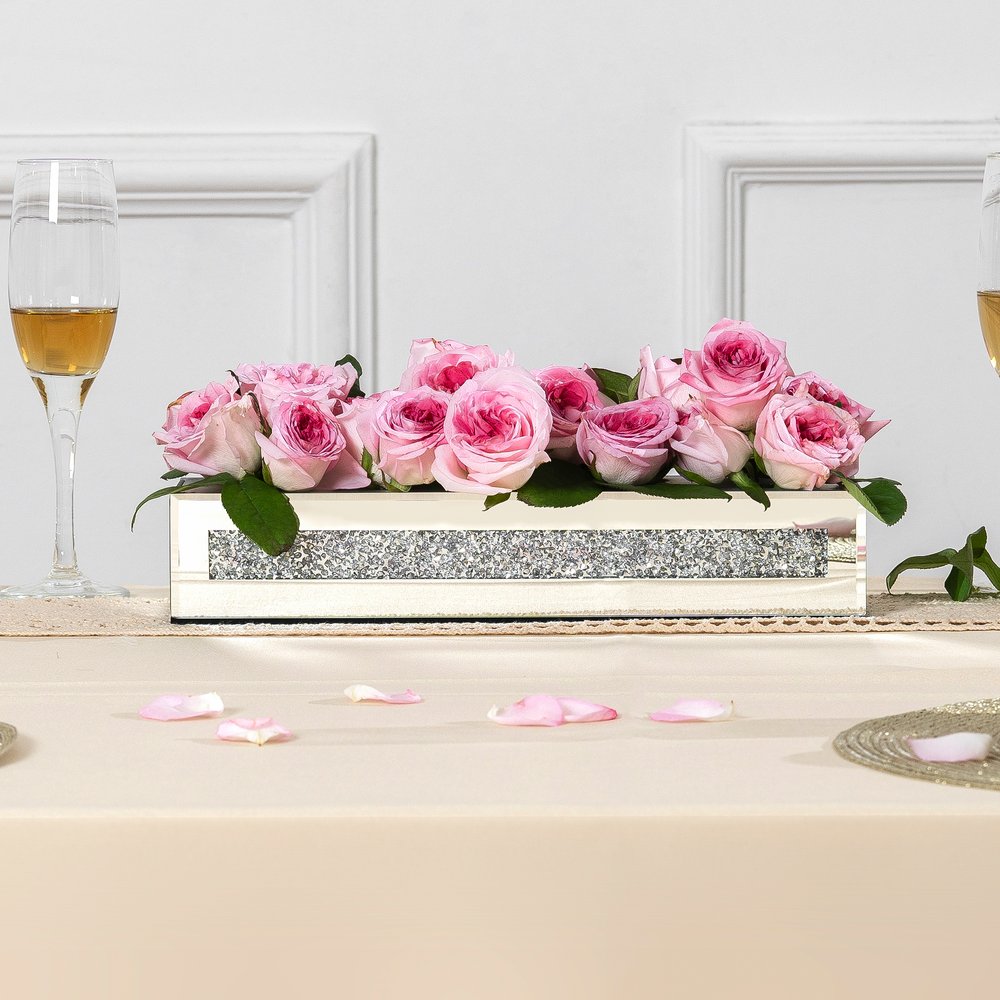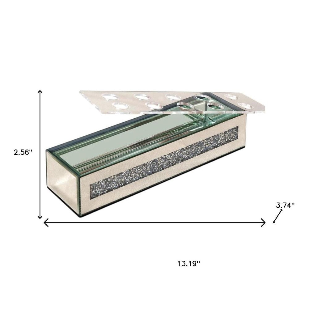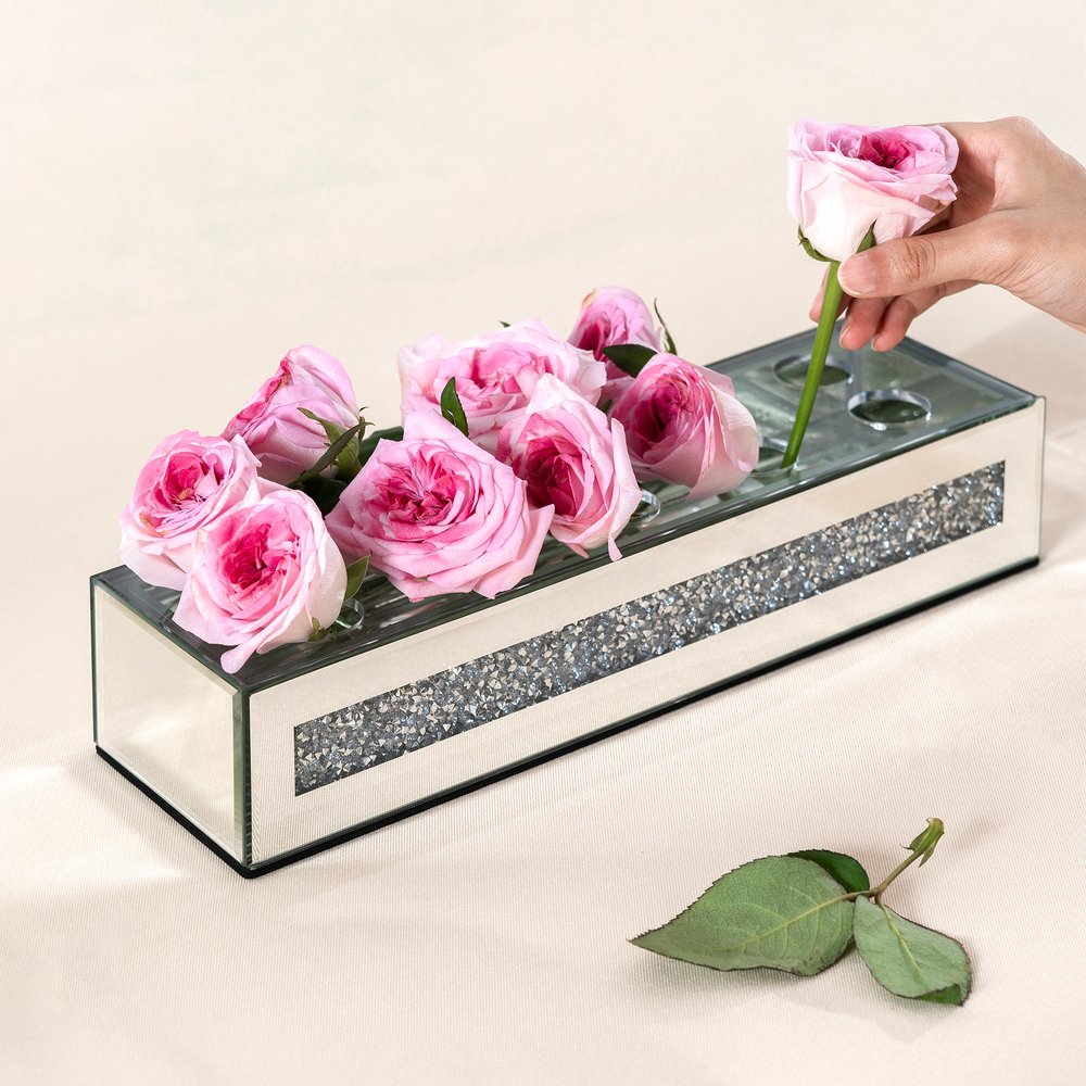 Ideal for displaying fresh or dried flowers, it effortlessly elevates your home ambiance. This exquisite floral holder features a sleek rectangular shape, adding a modern touch to any decor style. Crafted from luxurious mirrored glass and faux crystals, it reflects light beautifully, enhancing your space with a radiant glow. The watertight design ensures your floral arrangements remain fresh and vibrant without any leaks. Adorned with stunning crystals, this vase captures attention and offers an elegant accent that complements both contemporary and traditional interiors, making it a delightful addition to your home. 2.56-inch h x 13.19-inch w x 3.74-inch d.