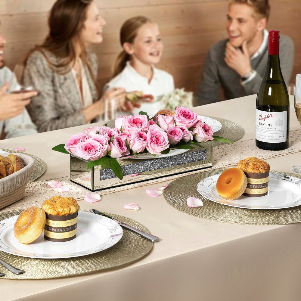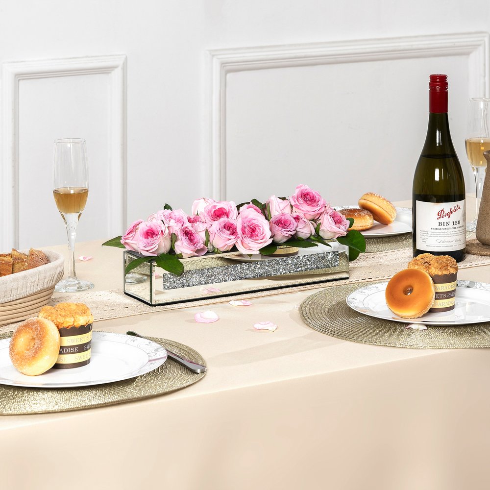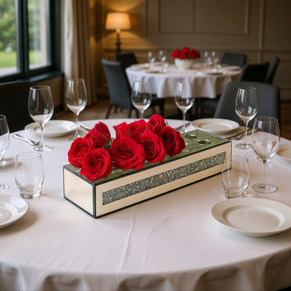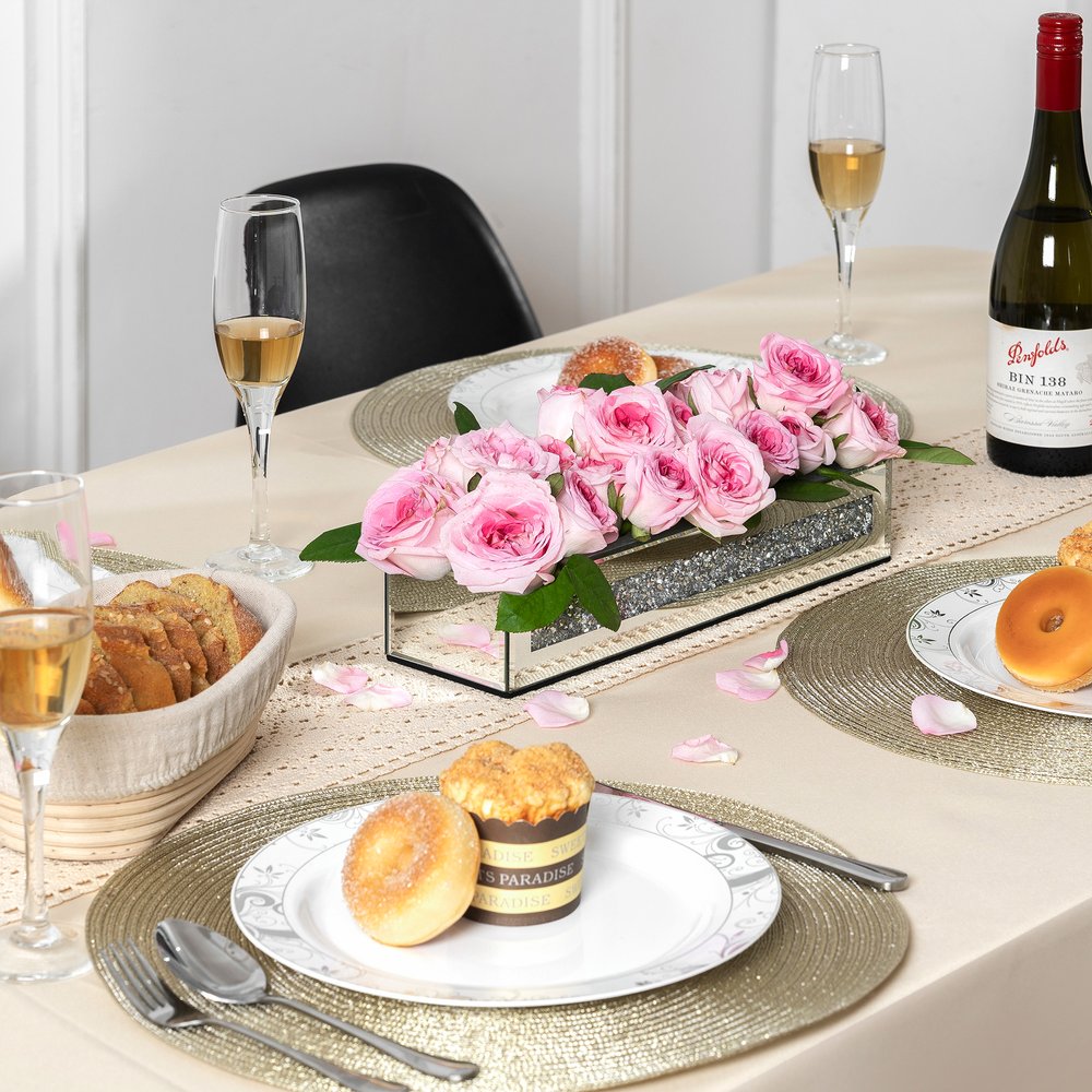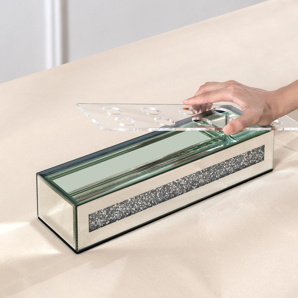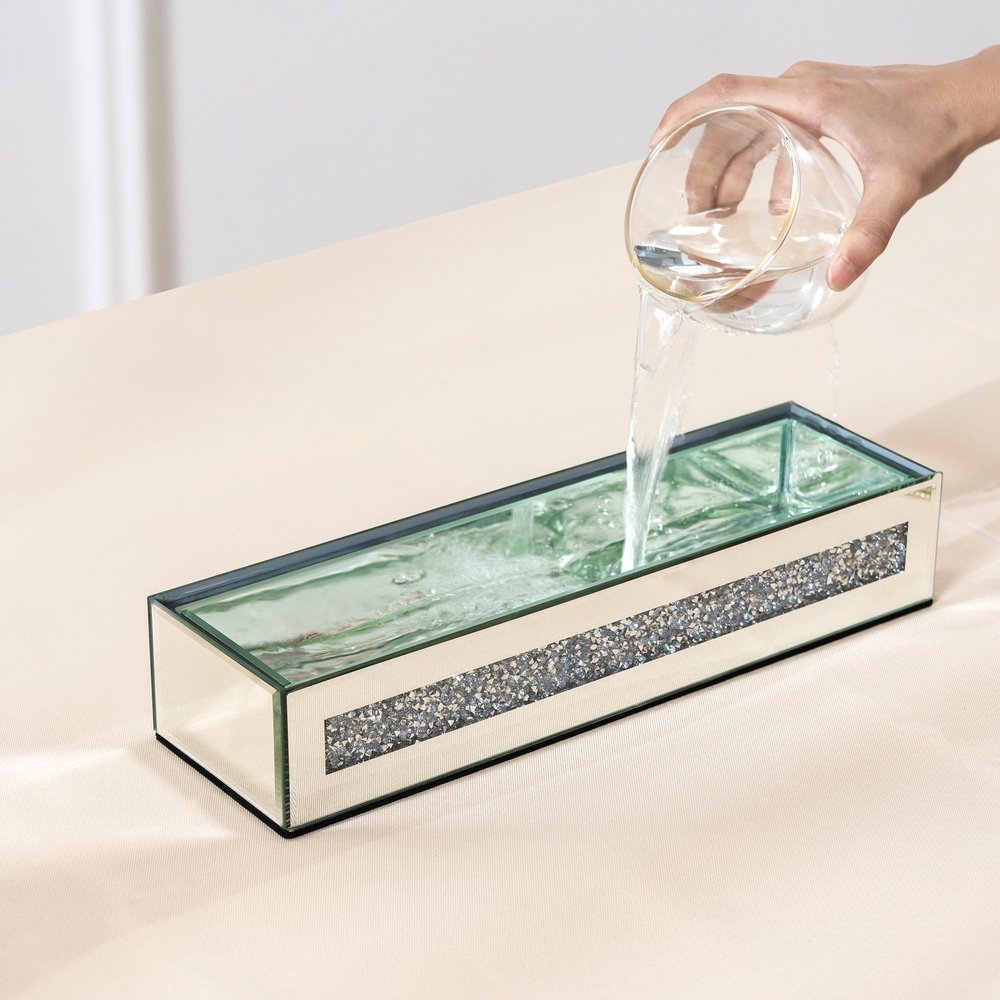Ideal for displaying fresh or dried flowers, it effortlessly elevates your home ambiance. This exquisite floral holder features a sleek rectangular shape, adding a modern touch to any decor style. Crafted from luxurious mirrored glass and faux crystals, it reflects light beautifully, enhancing your space with a radiant glow. The watertight design ensures your floral arrangements remain fresh and vibrant without any leaks. Adorned with stunning crystals, this vase captures attention and offers an elegant accent that complements both contemporary and traditional interiors, making it a delightful addition to your home. 2.56-inch h x 13.19-inch w x 3.74-inch d.