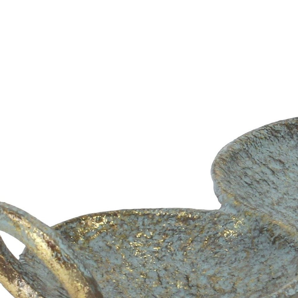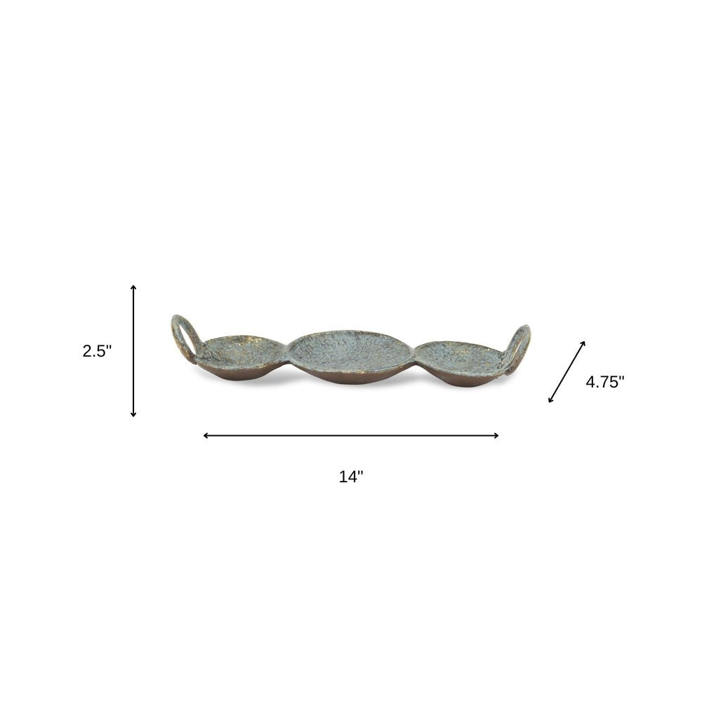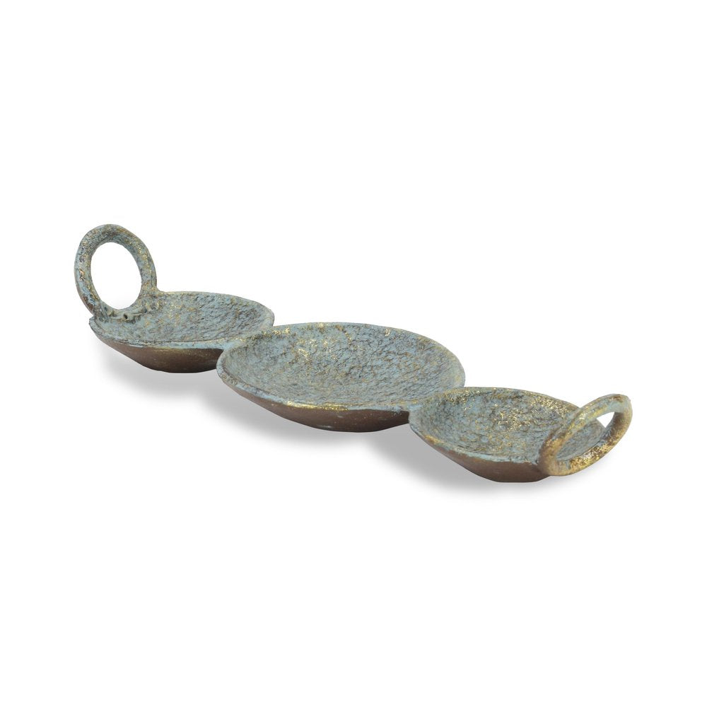 This 14-inch blue and gold round distressed cast iron tri circle vanity tray with handles will add a beautiful decorative accent to your space. This rustic and artisanal organically shaped vanity tray / jewelry holder features a warm and rustic brushed gold with an aged blue / green patina finish. Designed with handles for easy transport and convenience. Intended for decorative, non-food use only, it's perfect for holding jewelry, coins, keys, or displaying a collection of candles, perfume, décor, and more. 2.5-inch H x 14-inch W x 4.75-inch D