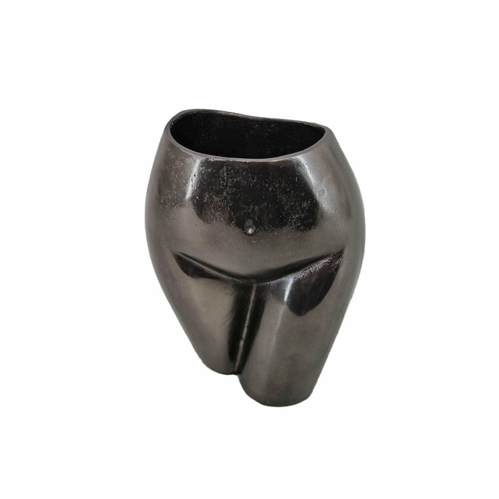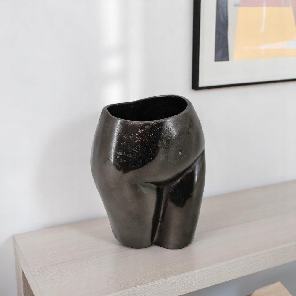 The 14-inch gold cast aluminum female form table vase is a stunning centerpiece that seamlessly blends art and functionality. Crafted from durable cast aluminum in a rustic and textural gold finish, this vase showcases a unique contemporary design that is sure to be a conversation starter. Ideal for displaying flowers or as a standalone art piece, it effortlessly elevates your room. Featuring the female body with its curves and contours, this sophisticated piece of art is also a functioning vase and will make a striking addition to your space. 14-inch h x 6.75-inch w x 5-inch d.