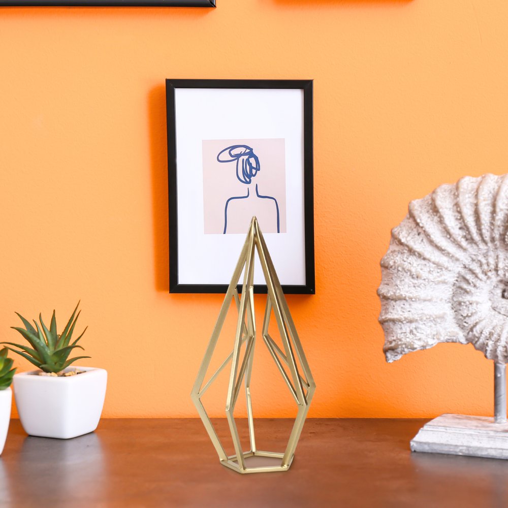 Unique and decorative, this 14-inch gold metal open geometric tabletop sculpture will leave a lasting impression. Its modern design features an intricate open geometric prism shape that add a contemporary flair to any space. Handcrafted with care, each piece showcases the artistry of skilled artisans, ensuring that no two sculptures are exactly alike. The metallic finish reflects light beautifully, making it a stunning focal point for your tabletop or shelf. This versatile sculpture effortlessly complements various decor styles, enhancing your home with sophistication and elegance. 13.75-inch h x 7-inch w x 6.75-inch d.