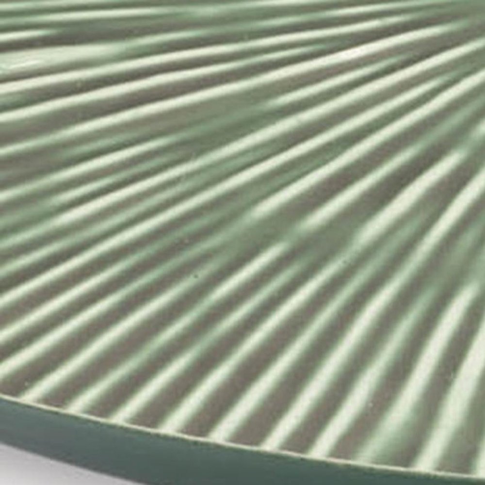 This 14-inch green metal etched round serving tray is beautiful enough to be left out on the counter or shelf when not in use. Made from metal that features an etched geometric lines pattern and a glossy glaze finish, this durable round serving tray is perfect to use as serveware or as a showcase for other objects just as beautiful as it is. A beautiful etched pattern adds to the appeal and decorative quality of this piece. Food safe and versatile, this serving tray is sure to please. 0.5-inch h x 13.75-inch w x 13.75-inch d.
