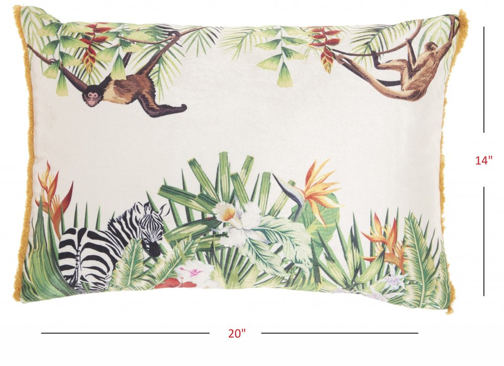 With this Multicolor Jungle Art Lumbar Pillow you can add the perfect pop of color to any seating space in your home. This rectangular shaped pillow is covered in a white colored fabric that serves as the background for the jungle art. The bottom half of the cushion features plants and flowers with a black and white zebra peeking through it while the top half features two monkeys hanging from vines and trees. Two sides have small mustard fringing on them which compliment junglescape perfectly. You can use this lumbar pillow anywhere in your home and add a pop of color to your bed, your couch, or any chair. 5" H x 14" W x 20" D