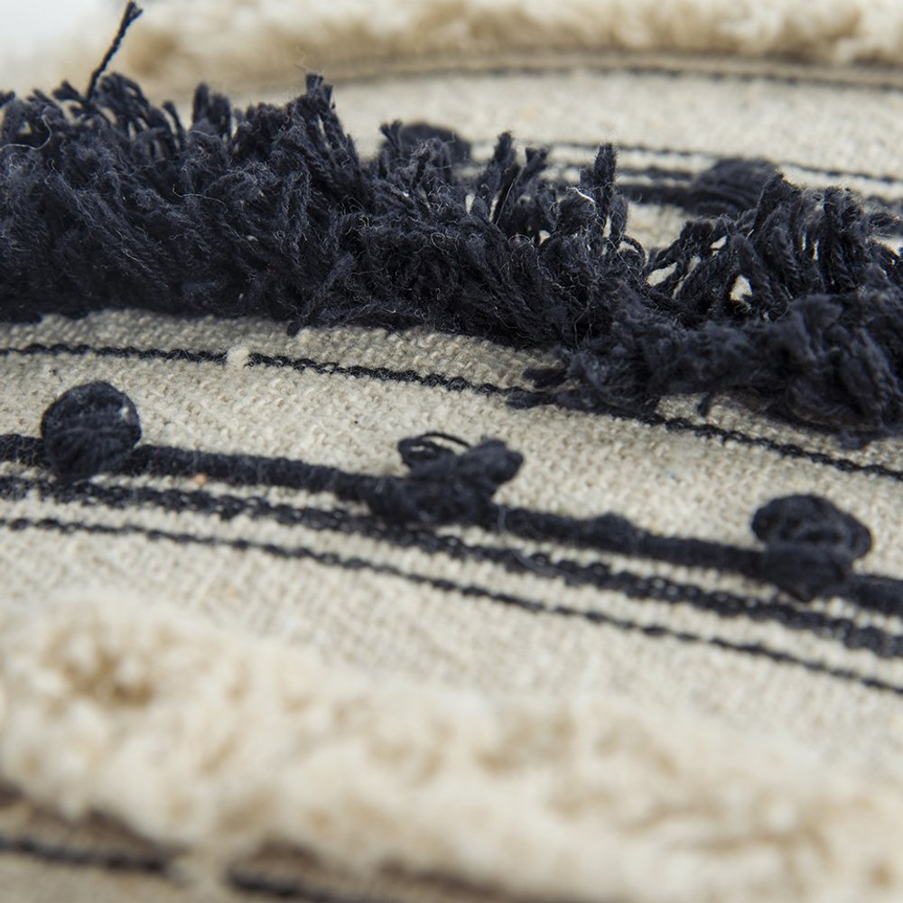 Add an air of fashion to your room with this cute and fashionable 14-inch x 26-inch beige and black cotton throw pillow that is a timeless classic that goes with anything from modern to coastal or bohemian. The pillow features a fancy combination of black and beige embroidery work with eyelash fringes and textural braids applied vertically on the natural beige base. Super soft and built to hold its shape, this polyester-filled pillow is a great option. Decorative pillows are a great way to change up the look and feel of your space easily and quickly. Embrace the artisanal quality of this lumbar pillow to lend a boho-chic vibe to your living room. 14-inch h x 26-inch w x 6.25-inch d.