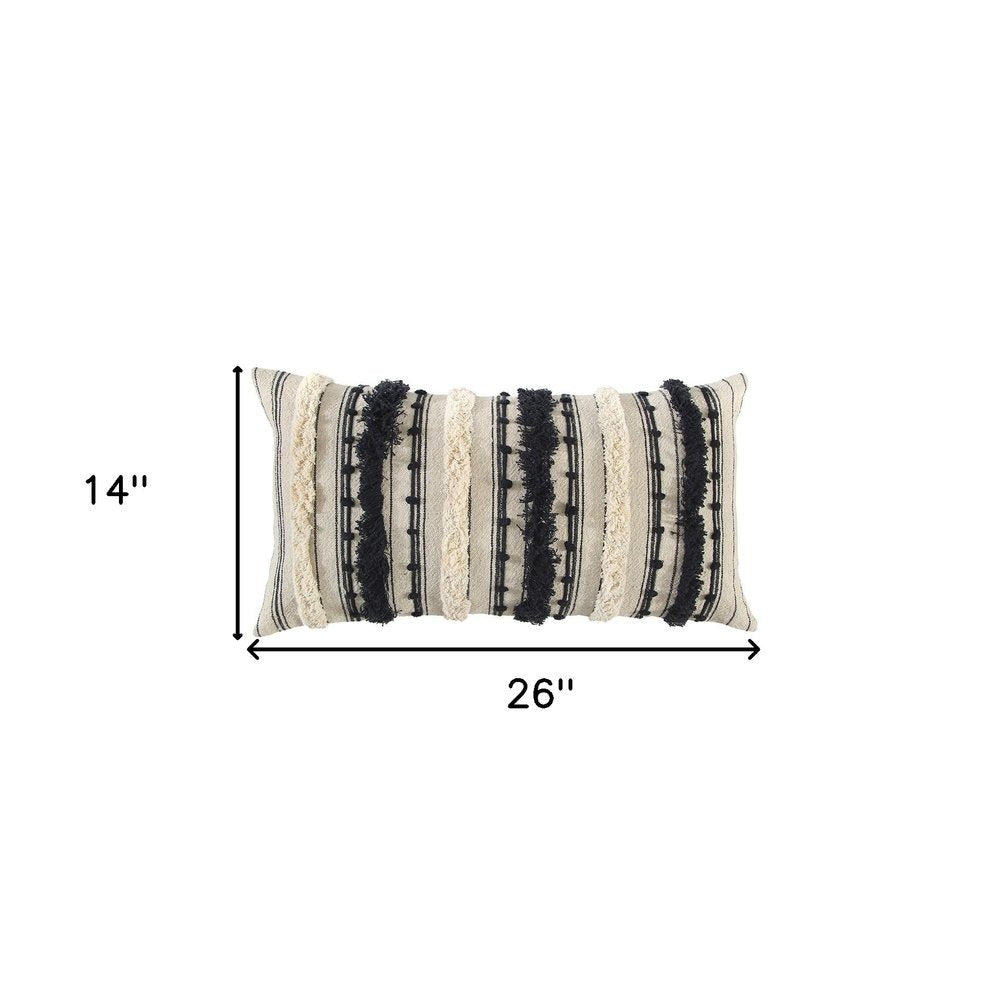 14" X 26" Beige And Black Cotton Throw Pillow With Fringe And Texture