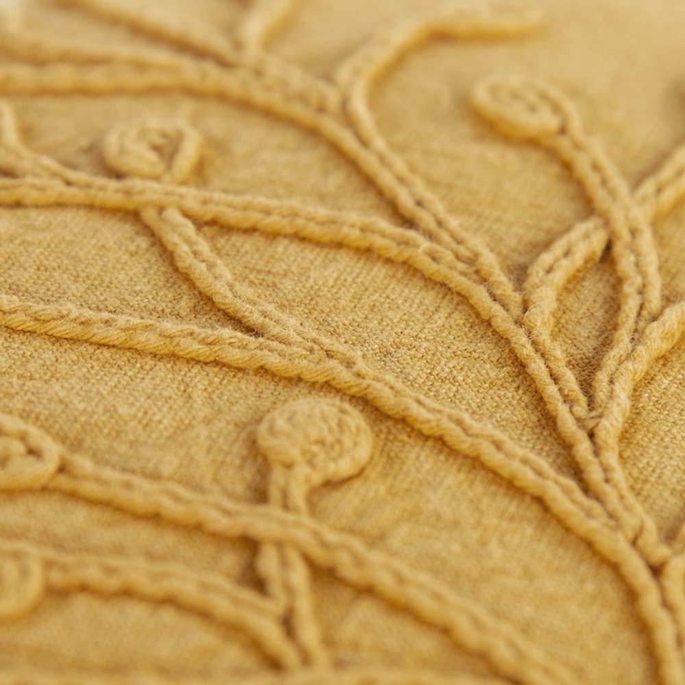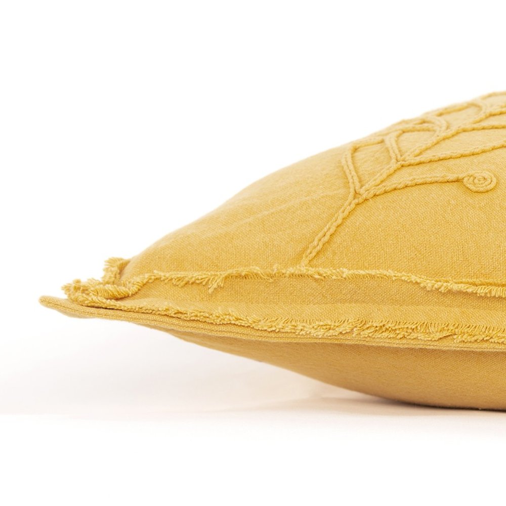 Simple and sophisticated in its decorative detailing, this Yellow Botanical Pattern Embroidered Lumbar Pillow is a gem. The monochromatic solid yellow base hosts corded embroidery, creating alluring botanical patterns that add texture and dimension to the pillow. The knife edging on the pillow is embellished with a frayed applied framing for visual appeal. . Give your living space positive energy with this decorative lumbar pillow paired with bright or neutral colored decors. 26” x 14” x 6.25”