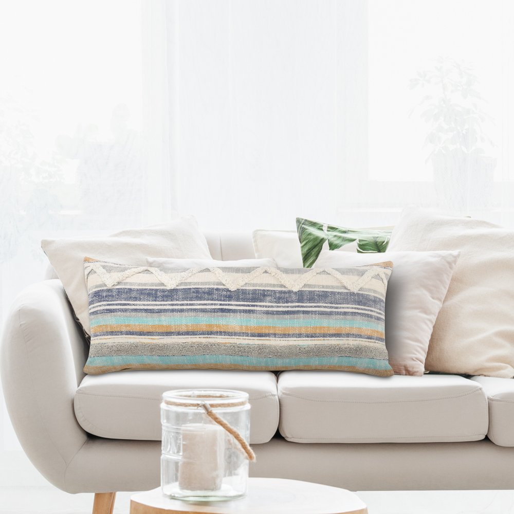This 14-inch x 36-inch blue and tan lumbar beach striped cotton throw pillow cover will add a beautiful decorative accent to your decor. This blue and tan hued, accent pillow cover, represents quality construction, expertly made from durable cotton that is not only long lasting but soft to the touch as well. Decorative pillow covers are a great way to change up the look and feel of your space easily and quickly. Combine with your own fill or insert to add decoration and dimension to your favorite chair, accent your sofa, or to use as part of your bed ensemble. 14.00-inch h x 36.00-inch w x 0.50-inch d.