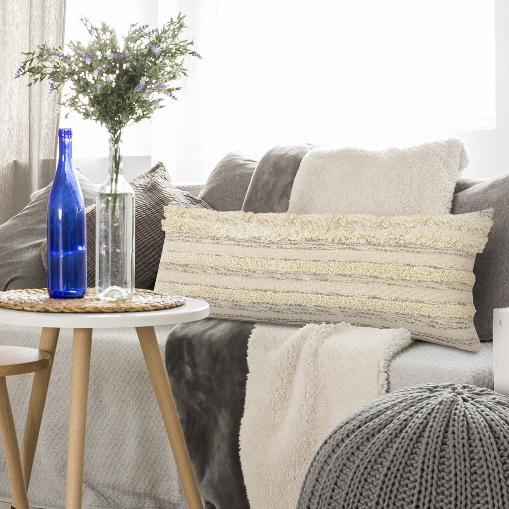 The perfect complement to your sofa, favorite chair, or bed, this 14-inch x 36-inch cream and gray lumbar striped cotton throw pillow cover is a great decorative accent. Durable cream and gray cotton has been used to give this pillow cover a beautiful look that will stand the test of time. Decorative pillow covers are a great way to change up the look and feel of your space easily and quickly. Combine with your own fill or insert to add decoration and dimension to your favorite chair, accent your sofa, or to use as part of your bed ensemble. 14.00-inch h x 36.00-inch w x 0.25-inch d.