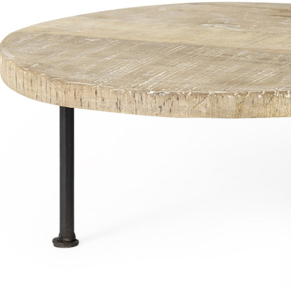 This 15-inch light brown round solid wood handmade riser tray will add a beautiful decorative accent to your decor. Purposefully weathered and distressed, this round wood slab sits on black metal legs and is purposefully weathered and distressed for a rustic and artisanal vibe. Intended for decorative, non-contact food use only, this display stand is perfect for raising and showcasing candles, plants, or any other items that you want to lift and elevate to create a more visually appealing space. This rustic raised tray enhances the ambiance of any room. 6-inch h x 15-inch w x 15-inch d.