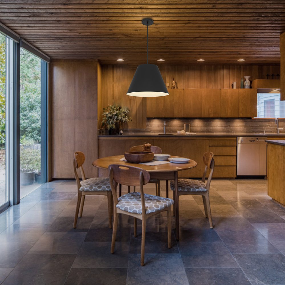 The 16-inch black aluminum cone LED dimmable outdoor pendant hanging light is designed to enhance your outdoor spaces with a stylish touch. Featuring a chic matte finish, this fixture boasts a contemporary shape that complements various decor styles. Made from durable aluminum, it ensures longevity while adding a modern flair to your patio, porch, kitchen, bathroom, or living room. The integrated LED provides energy-efficient lighting, perfect for creating a warm atmosphere during evening gatherings and the frosted glass adds a soft diffusion of light, enhancing the overall ambiance. Embrace the transitional style of this elegant pendant light, allowing it to illuminate your space with sophistication and charm. 11.00-inch h x 16.00-inch w x 16.00-inch d.