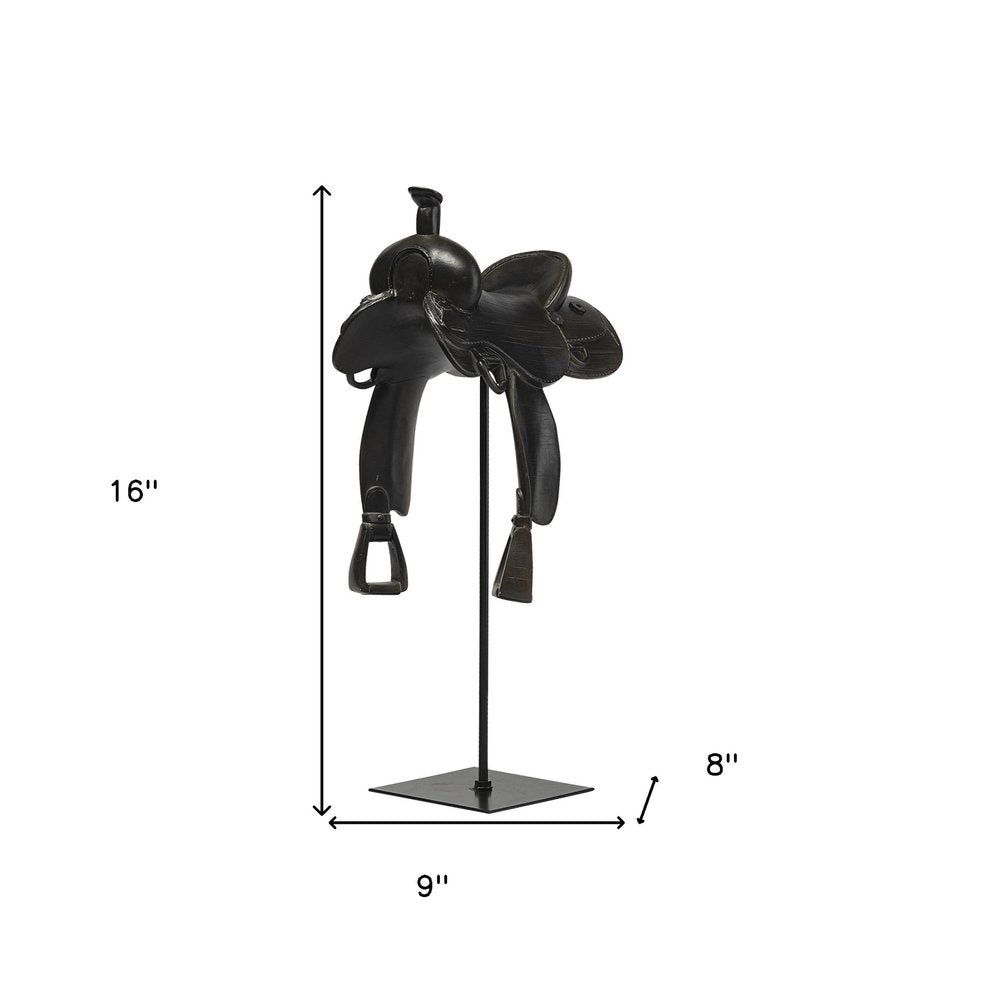 Live out your equestrian dreams with this eye-catching 16-inch black metal and resin horse saddle tabletop sculpture. The saddle is made from black faux leather and has details that mimic the details of a western horse riding saddle. The details are all made from thin metal and covered in the black leather. The saddle sits on top of a black metal rod which is connected to a black square metal base providing stability to this decor piece. This decor piece is a unique equestrian themed statement piece for your living room, office, bedroom, or mantle. 16-inch h x 8-inch w x 9-inch d.