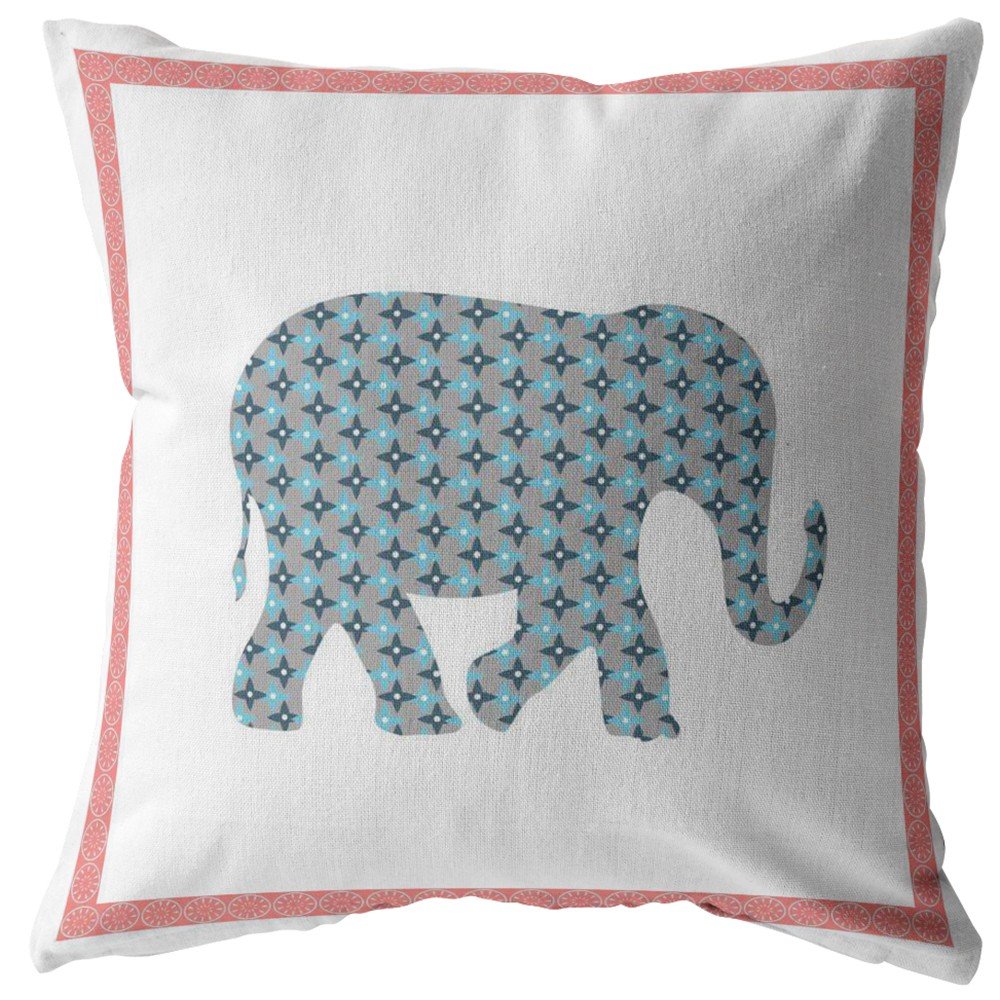 Combining an element of nature with a touch of class, this Blue Pink Elephant Zippered Suede Throw Pillow will incite a simplistic boho-chic feel into your home. Flaunting an eye-catching design representing an elephant in dove gray with diamond-star motifs in aqua and coral pink borders, the pillow creates an enchanting visual appeal leaving viewers in awe. The delicate drape in suede fabric not only gives this pillow a luxuriously smooth finish with a lustrous appearance but also ensures durability to last for years. The zippered cover makes it easy to take off and clean while also being eco-friendly. The delightful balance of trend and tradition in this alluring decorative throw pillow makes it a tasteful and sophisticated addition to any boho-chic home. 16” x 16” x 5”