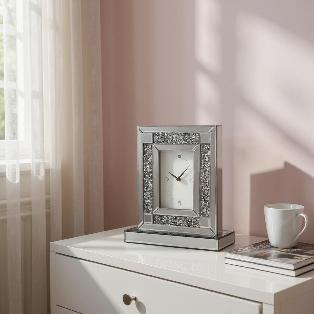 16" Silver And Black Faux Crystal And Mirrored Glass Table Clock