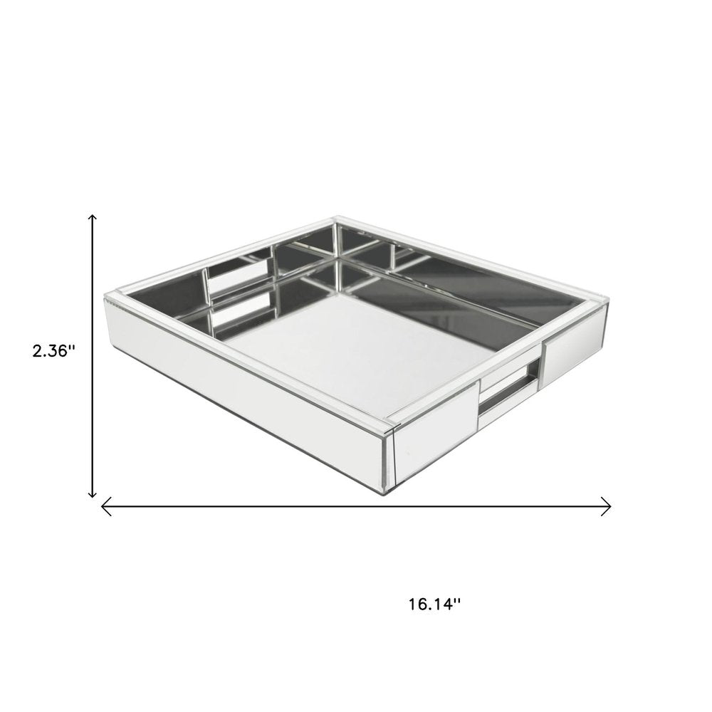 Freshen up your space with this convenient and good looking 16-inch silver mirrored glass serving tray with handles. This rectangular tray showcases a glamorous and sparkling design, making it a stunning addition to any decor. Crafted from high-quality mirrored glass, it reflects light beautifully, adding an elegant touch to your gatherings. With cut-out handles included, serving guests or moving items from one place to another is a breeze. Enjoy the versatility of this stylish tray for serving or display. 14.17-inch h x 16.14-inch w x 2.36-inch d.