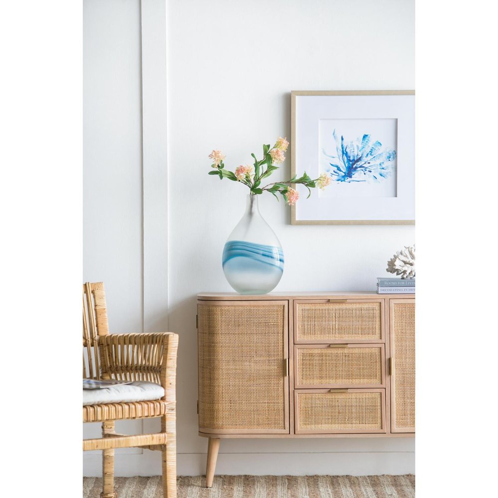 The 16-inch white and blue swirl art glass table vase adds a touch of elegance to any room. Crafted from high-quality glass, this vase features a striking blend of milky white and swirling blue hues that can enhance both modern and traditional decor. Its bulbous shape with a narrow neck is perfect for showcasing delicate flowers or as a standalone decorative piece. This vase serves as a stylish accent that can brighten up your living space while providing a chic focal point on tables or shelves. Ideal for garden-fresh blooms or artificial arrangements, this versatile table vase is a delightful addition to your home decor collection. 16.3-inch h x 10.2-inch w x 5.7-inch d.