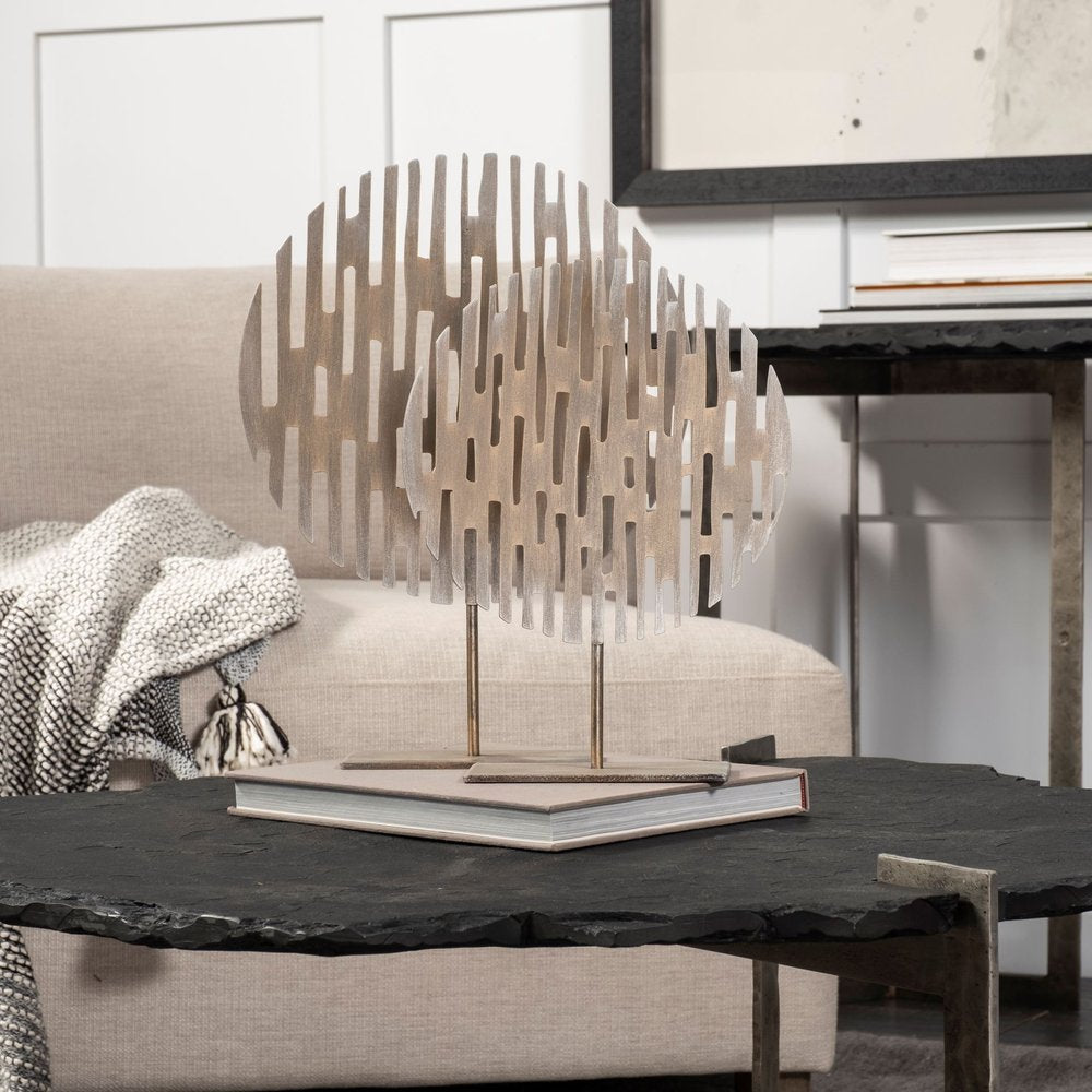 Add an air of fashion to your room and rejuvenate the space with this 17-inch antiqued gold round disc metal tabletop sculpture. This unique piece is made from solid metal and features a metal stand with a round metal shape on top. The rectangle base has a thin rod that comes up and holds a round flat disc with an abstract cutwork pattern. The antiqued gold coloring of this high quality metal accent will look great in most any space. A perfect decorative addition for anyone who loves a stylish look and feel. 17-inch h x 3-inch w x 13-inch d.