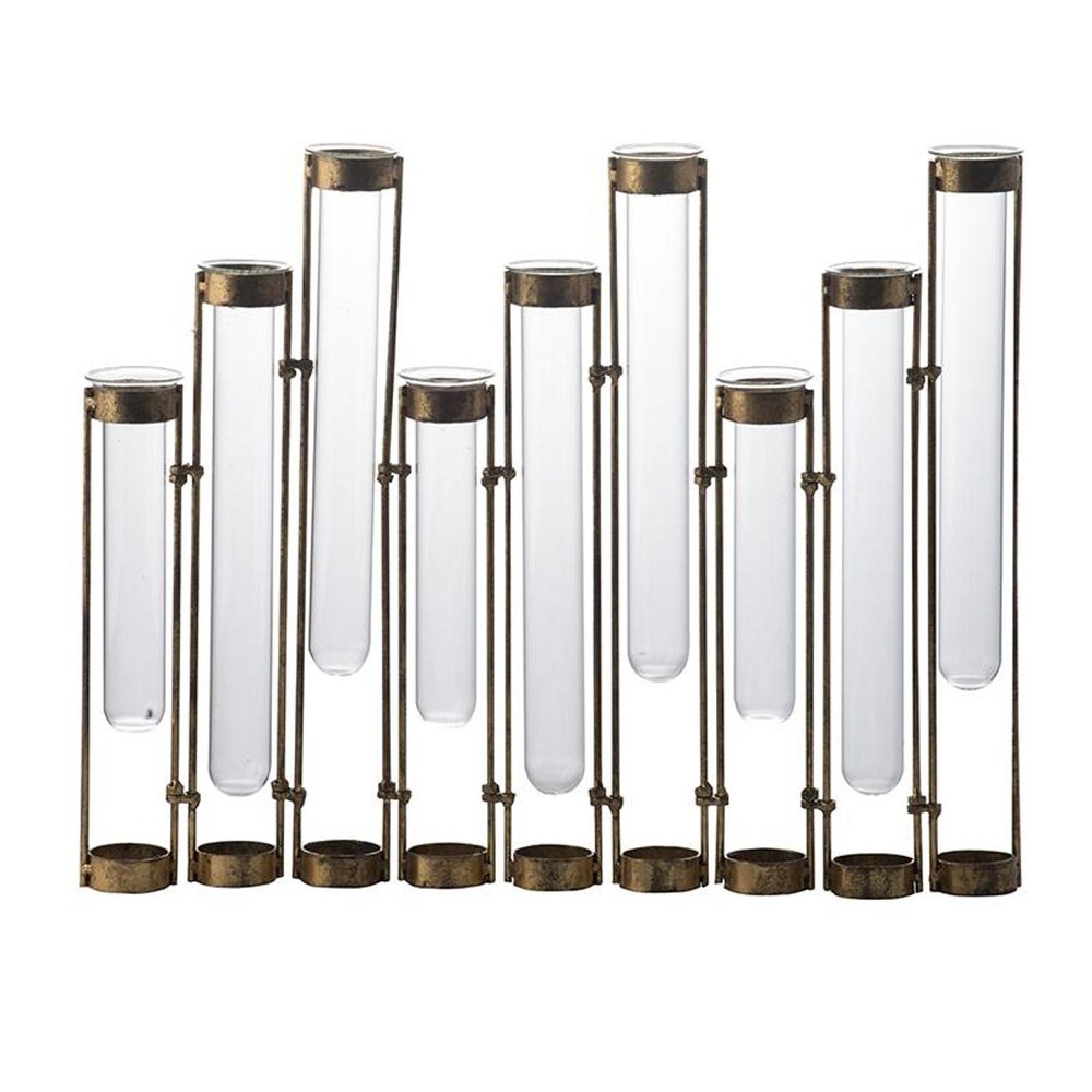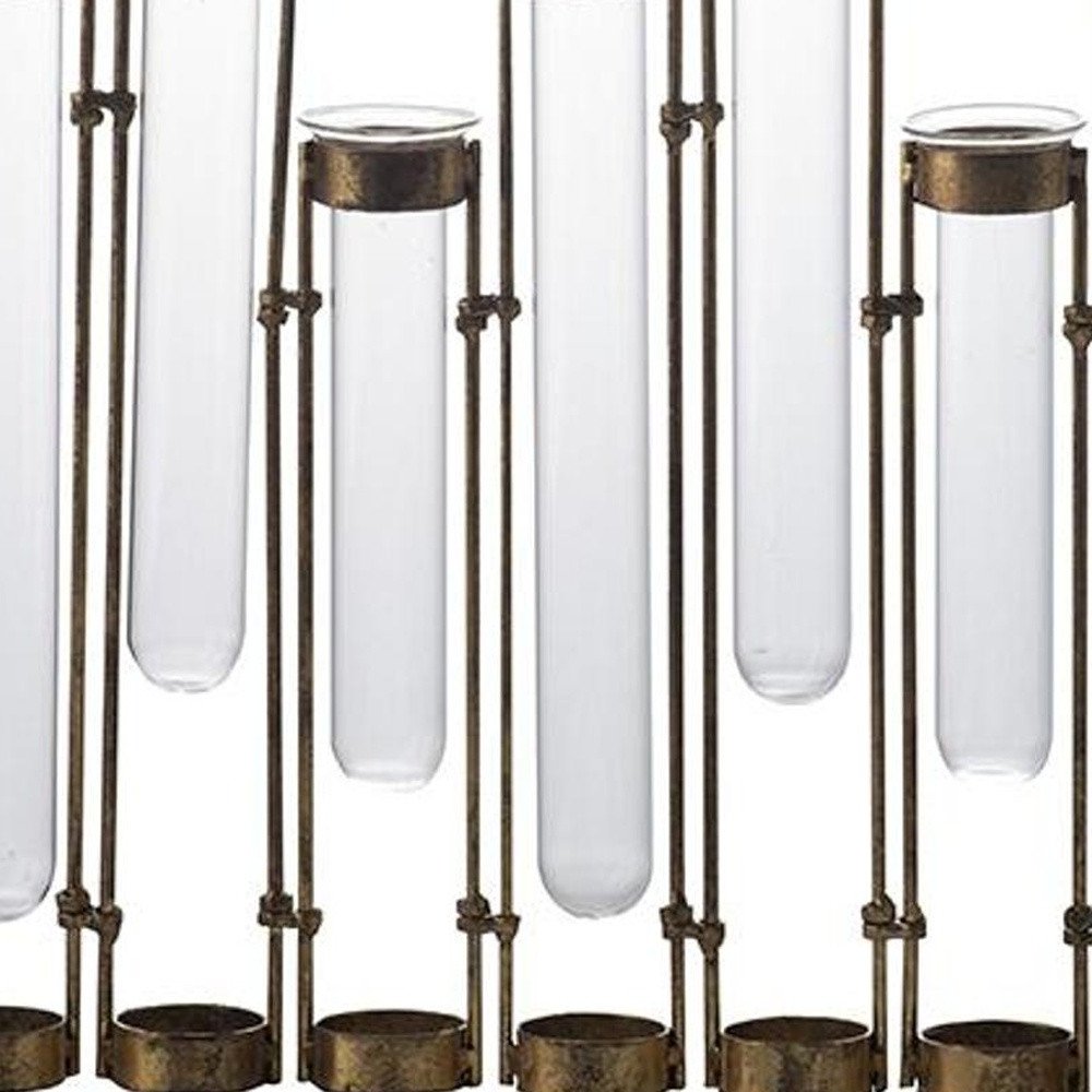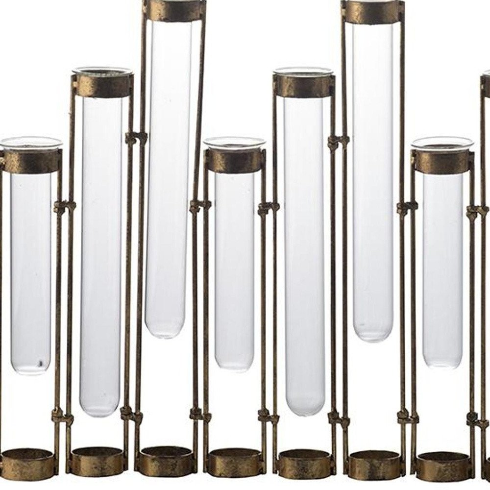Get ready to accent your space in style with this 17-inch bronze and clear enameled cast iron and glass nine bloom table vase. This multi glass vial design adds a unique touch that makes is the perfect centerpiece for any table setting. Its unique blend of materials ensures it stands out while harmonizing with various decor styles. Ideal for displaying fresh flowers or as a decorative piece on its own, this vase will effortlessly enhance your home ambiance. Elevate your interior design with this charming addition. 13.80-inch h x 17.70-inch w x 1.80-inch d.
