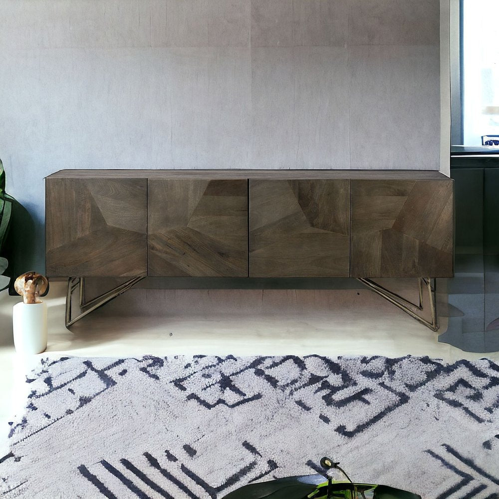 Storage vessels don't have to be unsightly. Increase your storage space and the fashion quotient of your room with this hard-wearing, versatile, and good-looking cabinet. Crafted from solid wood, this modern sideboard in a rich dark brown color features shelves and doors, enhancing both functionality and style. The solid wood construction ensures durability while the ample storage space allows for organized living without compromising on aesthetics. Ideal for contemporary interiors seeking a sleek and sophisticated storage solution, this sideboard seamlessly combines form and function to elevate your living space. 29.9-inch H x 17.3-inch W x 80.1-inch D