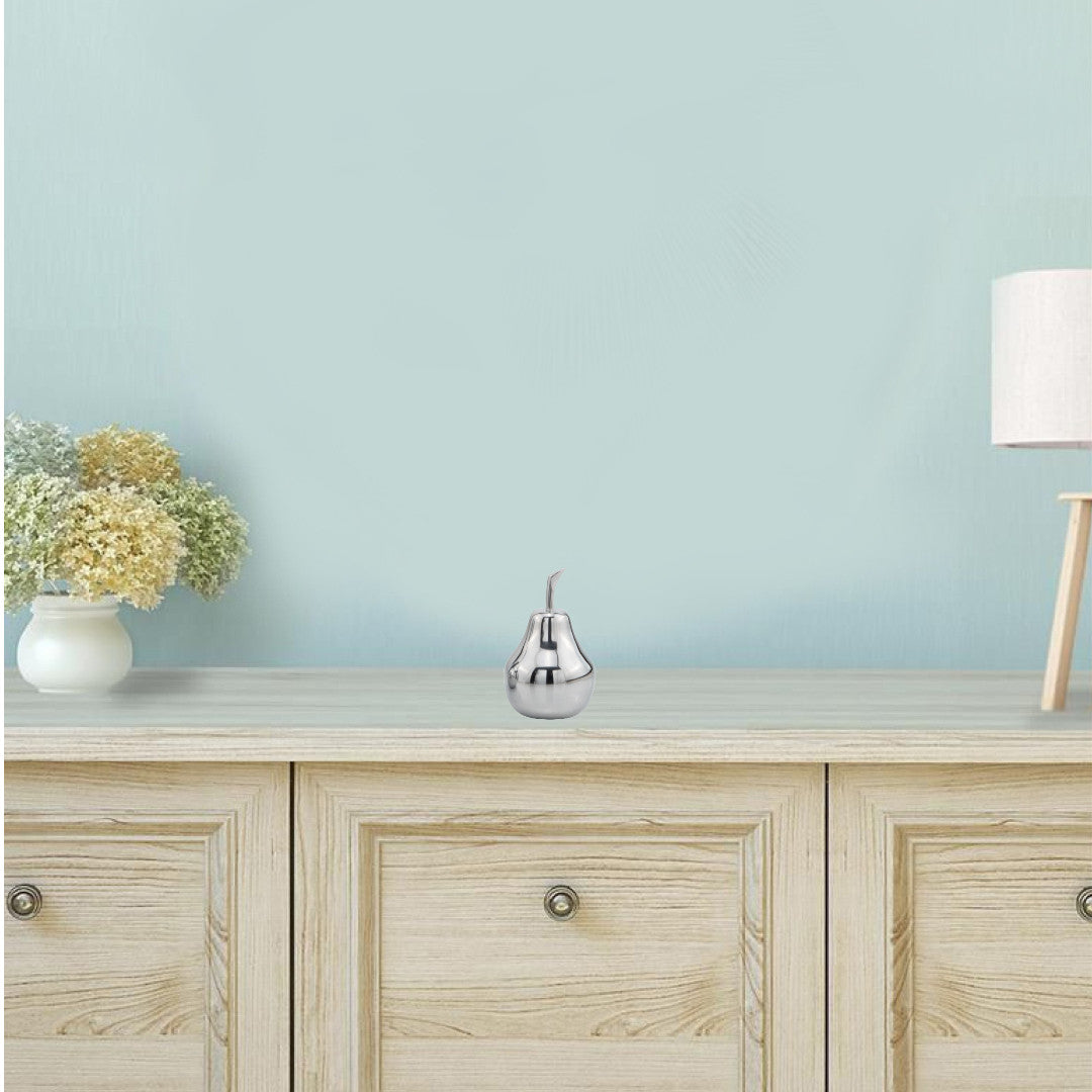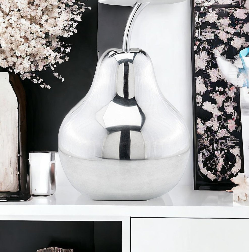 This decorative pear sculpture crafted from high grade buffed aluminum boasts a sleek silver color that adds a contemporary touch to any space. The modern style of this piece complements a variety of decor styles, making it a versatile and chic accent for your home. Its intricate design and expert craftsmanship make it a standout decorative item that exudes sophistication and style. Perfect for those seeking a unique and eye-catching addition to their living space, this sculpture is sure to impress with its high-quality construction and trendy aesthetic. 17-inch H x 12-inch W x 12-inch D