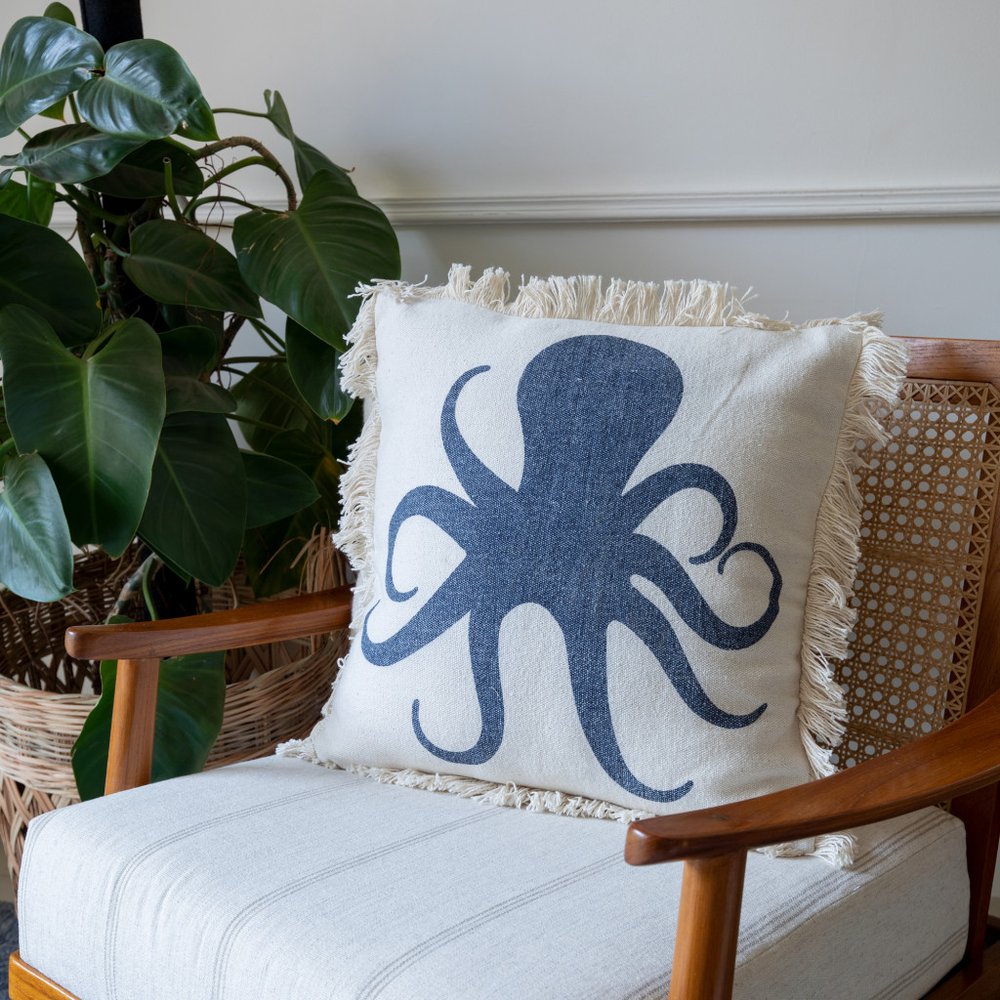 The perfect complement to your sofa, favorite chair, or bed, this 18-inch blue and white beach cotton throw pillow cover is a great decorative accent. This soft and durable decorative pillow cover is expertly made of high grade, long lasting cotton in a blue and white coloration. Pillow covers are a good idea for anyone that loves to decorate or accent their space with color and texture. Combine with your own fill or insert to add decoration and dimension to your favorite chair, accent your sofa, or to use as part of your bed ensemble. 18.00-inch h x 18.00-inch w x 0.50-inch d.