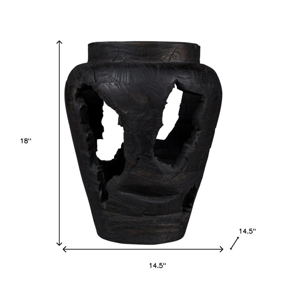 This 18-inch black solid wood table vase with sculptural details is the perfect accent for your living room, bedroom, dining room, or lounge. Its purposeful distressing adds a unique character, enhancing the aesthetic appeal of your space. Hand-painted craftsmanship ensures that each piece is distinct and showcases an artist's touch. Made from durable solid wood, this vase promises longevity while serving as a stunning decor element. The intricate sculptural details create an eye-catching focal point that will draw attention and admiration from guests. Ideal for displaying fresh flowers or as a statement piece on its own. 18.00-inch h x 14.50-inch w x 14.50-inch d.