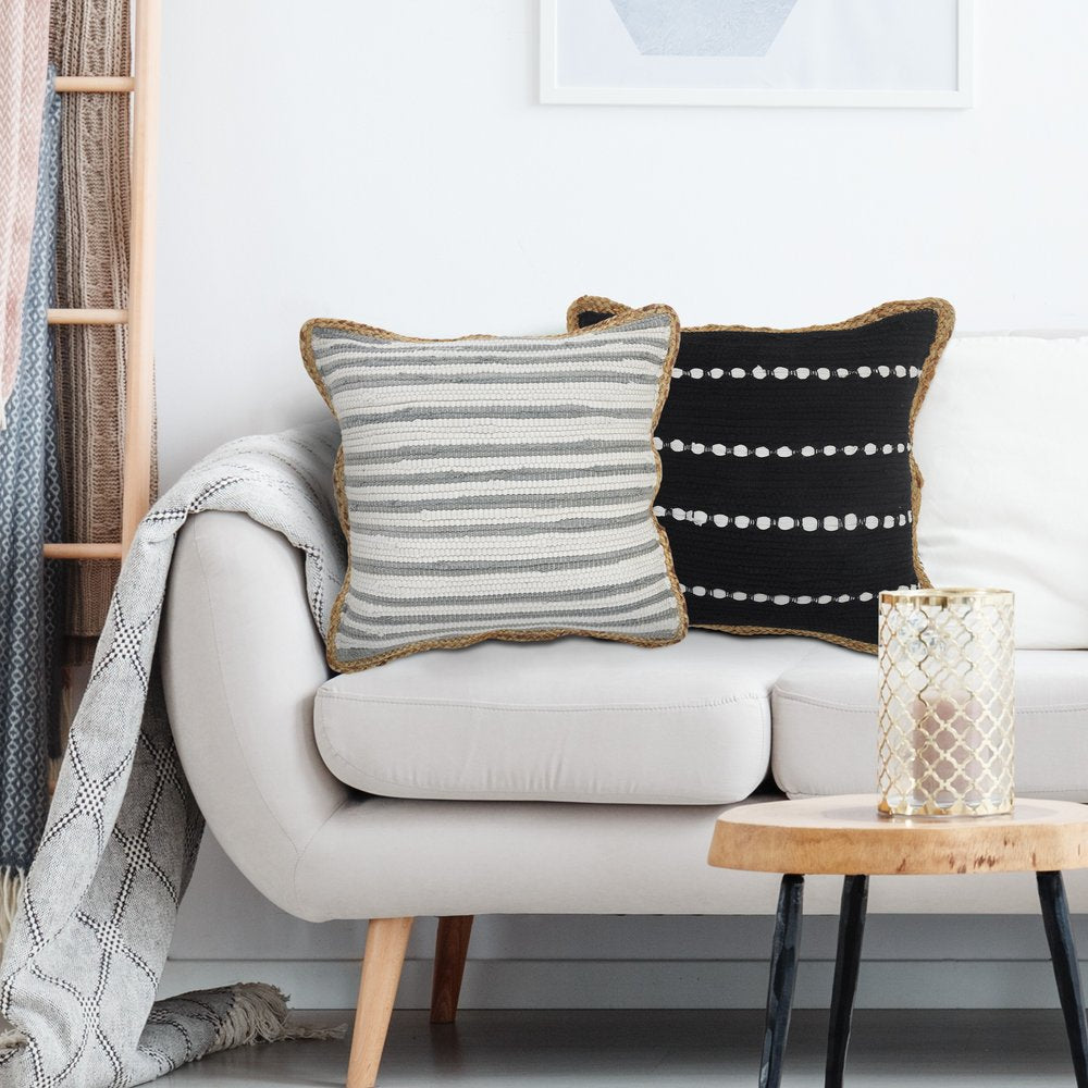 The 18-inch gray and off white striped cotton blend throw pillow cover is the perfect decorative accessory for your home. This soft and durable decorative pillow cover is expertly made of high grade, long lasting cotton blend in a gray and off white coloration. Pillow covers are a good idea for anyone that loves to decorate or accent their space with color and texture. Combine with your own fill or insert to add decoration and dimension to your favorite chair, accent your sofa, or to use as part of your bed ensemble. 18.00-inch h x 18.00-inch w x 0.50-inch d.