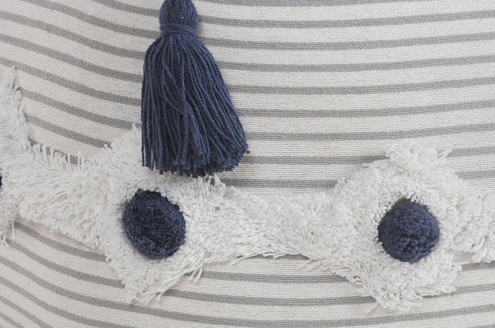 Practicality and fashion mix together with this handy 18-inch gray cotton striped pouf ottoman. Add chic style to your space with this fun pouf that not only looks cool but can be a great foot rest or extra seat when needed. Expertly upholstered with padding and soft 100% cotton in a striped pattern, this ottoman is as comfortable as it is good looking. Ottomans are multi-functional additions to your space that add fashion and practical value. 14-inch h x 18-inch w x 18-inch d.