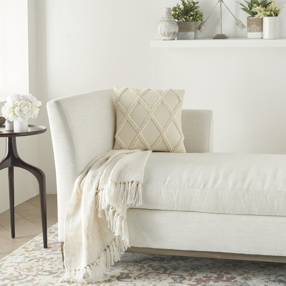This comforting Ivory Textured Lattice Throw Pillow is the perfect blend of fashion and comfort to make your home feel and look in tune with the neo-casual style of the new age. This soft-touch throw pillow is made with 60% cotton and 40% polyester to make sure your perfect aesthetic stays as perfect as the first day you created it. Each and every corner of the bold pillow is textured with vastly refined materials to make sure it feels comforting and satisfying throughout its lifetime. The playful texture is the base for the beautifully raised lattice pattern woven all over the surface to perfectly accentuate every decor piece it is placed with. 18” x 18” x 5”