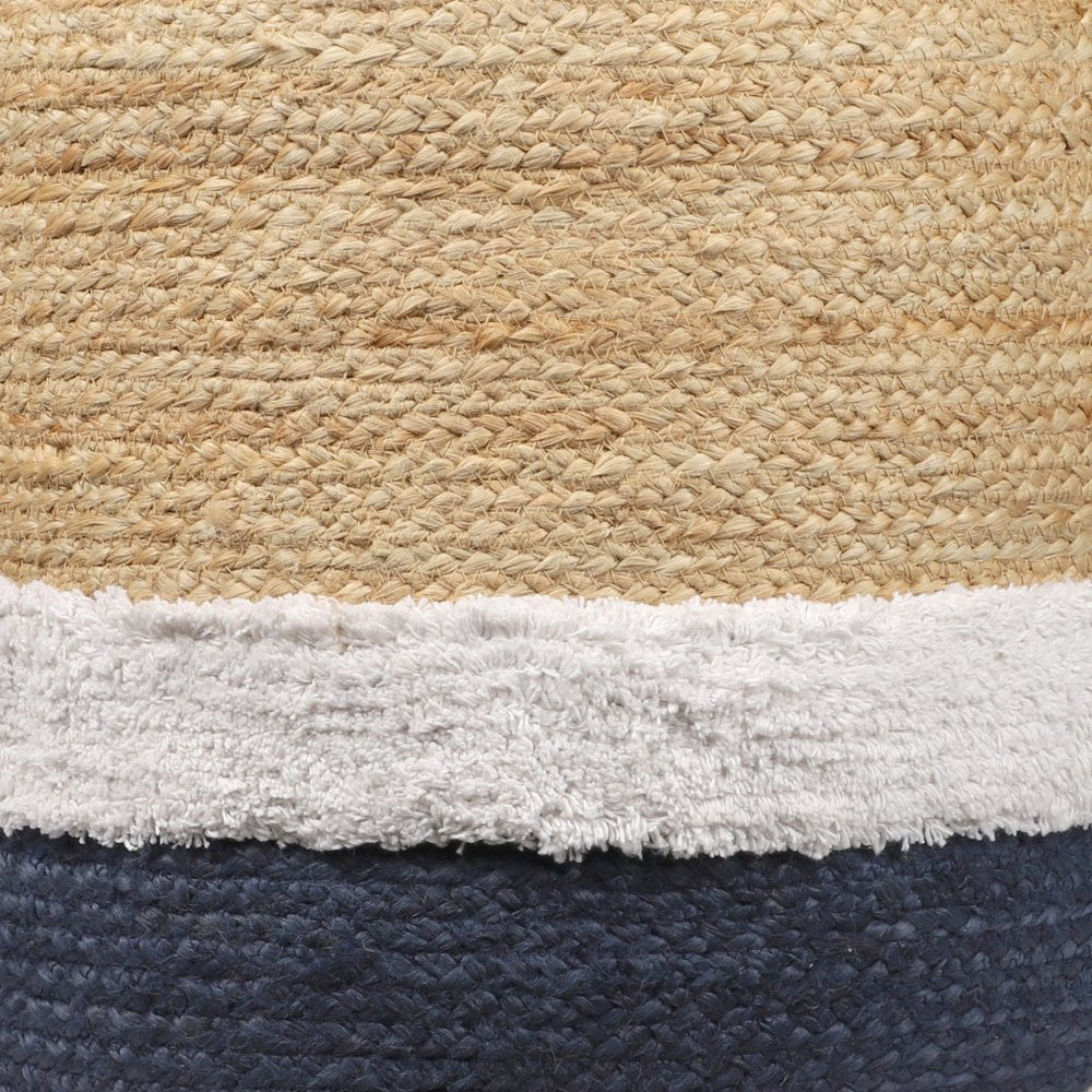 18" Natural And Navy Blue Jute Blend Cylinder Striped Pouf Ottoman