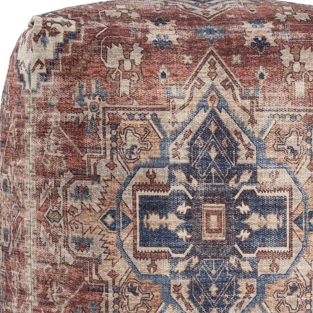 18" Navy Blue and Terra Cotta Upholstered Medallion Pouf Ottoman