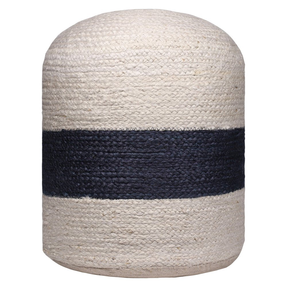 Practicality and fashion mix together with this handy 18-inch off white and navy blue jute blend cylinder striped pouf ottoman. Add chic style to your space with this fun pouf that not only looks cool but can be a great foot rest or extra seat when needed. Handmade from jute with a touch of cotton and accent striping, this unique design has a bohemian flair and is as comfortable as it is good looking. Easy to blend into most any room, a ottoman is a way to add a good looking accent to your space that can also be practical and useful. 18-inch h x 18-inch w x 18-inch d.