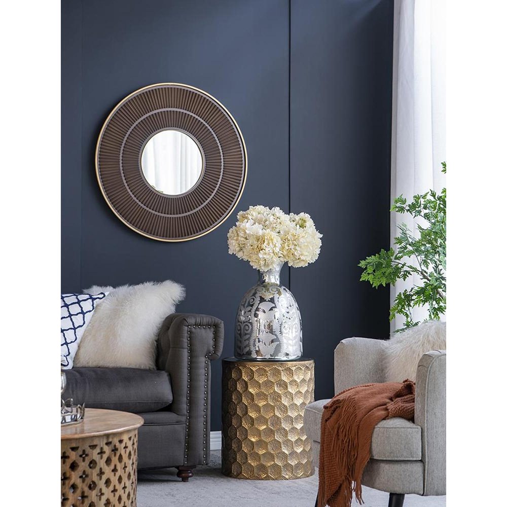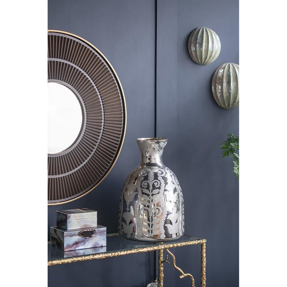 The 18-inch silver floral round glass table vase effortlessly combines elegance and functionality. Its round shape adds a classic touch to any room, making it a versatile choice for various decor styles. Crafted from high-quality glass, this vase showcases a shimmering silver finish that enhances its beauty. With a traditional style, it complements both modern and vintage interiors seamlessly. Perfect for displaying fresh flowers or as a standalone decorative piece, this vase brings an air of sophistication to your home. Measuring 18 inches in height, it is the ideal size to make a statement on tables, shelves, or mantels. Elevate your decor with this stunning addition that gracefully merges artistry with practicality. 17.9-inch h x 12-inch w x 12-inch d.