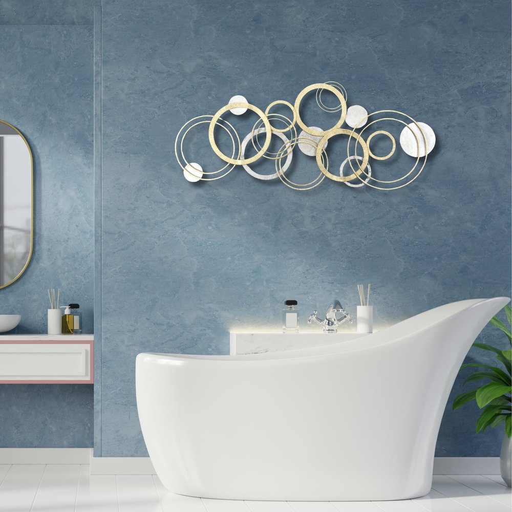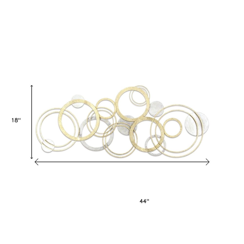 Handmade with care, this piece brings some modern authenticity to your space. Crafted from durable metal, this wall decor showcases a stunning blend of artistry with a mix of gold and silver overlapping and different sized rings. This hanging dimensional sculpture creates a striking focal point, inviting admiration from guests and enhancing the overall aesthetic of your room. Each handmade detail reflects a unique craftsmanship that ensures no two pieces are exactly alike. Perfect for elevating your decor, this exquisite modern wall art is ideal for living rooms, hallways, or any area that needs a stylish upgrade while exuding sophistication and charm. 18.00-inch h x 44.00-inch w x 0.75-inch d.