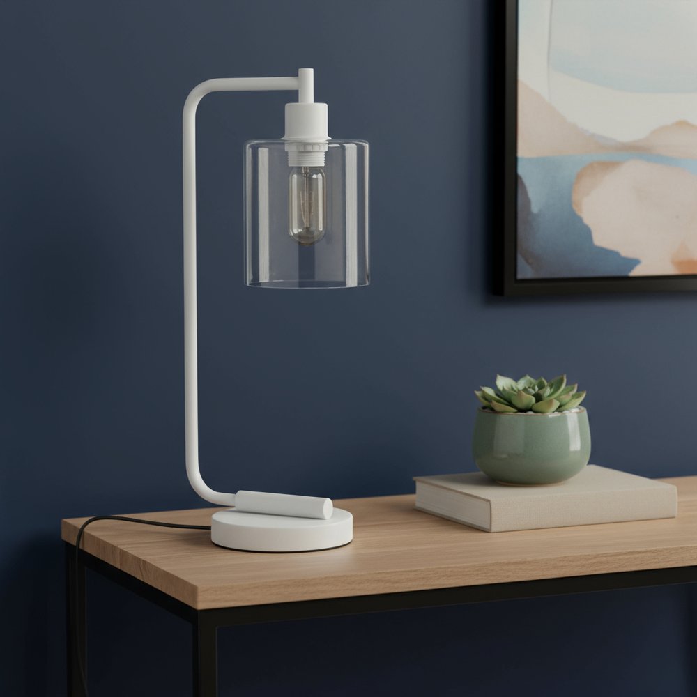 Truly a mix of design and functionality that doesn't compromise on style, this 19-inch white metal lantern table lamp with clear cylinder shade will be a great addition to your space. The base of this lamp is made of metal finished in a white tone. The clear cylinder glass shade is finishes this piece off nicely and symmetrically this standard table lamp is designed to provide general lighting to the area. High quality design makes this a great lamp for not only lighting, but accenting a room with style. It is perfect for virtually any decor. 18.80-inch h x 5.75-inch w x 9.75-inch d.